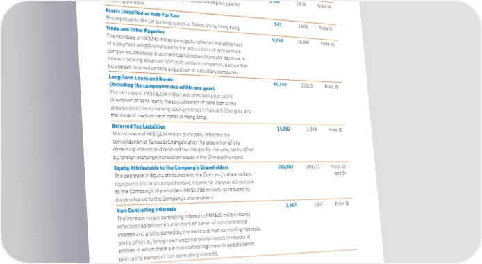 MANAGEMENT DISCUSSION & ANALYSIS FINANCIAL REVIEW Consolidated Statement of Financial Position (continued) 2023 2022 HK$M HK$M Reference Trade and Other Receivables 3,506 2,834 Note 24 The increase of HK$672 million mainly reflected the deposit paid for tendering purpose. Assets Classified as Held For Sale 543 2,038 Note 31 This represents 384 car parking spaces at Taikoo Shing, Hong Kong. Trade and Other Payables 9,763 10,008 Note 26 The decrease of HK$245 million principally reflected the settlement of a payment obligation related to the acquisitions of joint venture companies, decrease in accrued capital expenditure and decrease in interest-bearing advances from joint venture companies, partly offset by deposit received and the acquisition of subsidiary companies. Long-Term Loans and Bonds 41,169 22,835 Note 28 (including the component due within one year) The increase of HK$18,334 million was principally due to the drawdown of bank loans, the consolidation of bank loan at the acquisition of the remaining equity interest in Taikoo Li Chengdu, and the issue of medium term notes in Hong Kong. Deferred Tax Liabilities 14,082 11,248 Note 30 The increase of HK$2,834 million principally reflected the consolidation of Taikoo Li Chengdu after the acquisition of the remaining interest and deferred tax charges for the year, partly offset by foreign exchange translation losses in the Chinese Mainland. Equity Attributable to the Company’s Shareholders 285,082 289,211 Notes 33 The decrease in equity attributable to the Company’s shareholders and 34 represents the total comprehensive income for the year attributable to the Company’s shareholders (HK$1,780 million), as reduced by dividends paid to the Company’s shareholders. Non-Controlling Interests 3,067 3,047 Note 36 The increase in non-controlling interests of HK$20 million mainly reflected capital contribution from an owner of non-controlling interest and profits earned by the owners of non-controlling interests, partly offset by foreign exchange translation losses in respect of entities in which there are non-controlling interests and dividends paid to the owners of non-controlling interests. 78