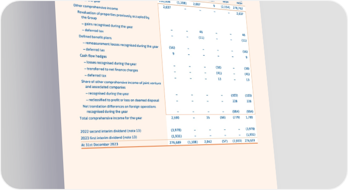 SWIRE PROPERTIES ANNUAL REPORT 2023 34. Reserves Property Cash flow Revenue Merger revaluation hedge Translation reserve reserve reserve reserve reserve Total HK$M HK$M HK$M HK$M HK$M HK$M At 1st January 2023 280,008 (1,108) 2,007 9 (2,154) 278,762 Profit for the year 2,637 – – – – 2,637 Other comprehensive income Revaluation of properties previously occupied by the Group – gains recognised during the year – – 46 – – 46 – deferred tax – – (11) – – (11) Defined benefit plans – remeasurement losses recognised during the year (56) – – – – (56) – deferred tax 9 – – – – 9 Cash flow hedges – losses recognised during the year – – – (38) – (38) – transferred to net finance charges – – – (41) – (41) – deferred tax – – – 13 – 13 Share of other comprehensive income of joint venture and associated companies – recognised during the year – – – – (103) (103) – reclassified to profit or loss on deemed disposal – – – – 228 228 Net translation differences on foreign operations recognised during the year – – – – (904) (904) Total comprehensive income for the year 2,590 – 35 (66) (779) 1,780 2022 second interim dividend (note 13) (3,978) – – – – (3,978) 2023 first interim dividend (note 13) (1,931) – – – – (1,931) At 31st December 2023 276,689 (1,108) 2,042 (57) (2,933) 274,633 195
