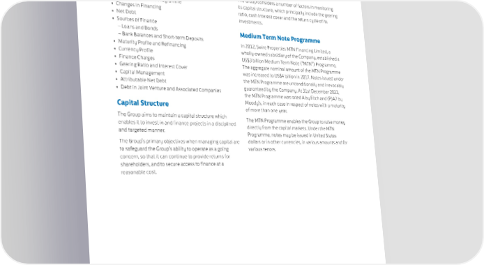 SWIRE PROPERTIES ANNUAL REPORT 2023 FINANCING • Capital Structure The Group considers a number of factors in monitoring • Medium Term Note Programme its capital structure, which principally include the gearing • Changes in Financing ratio, cash interest cover and the return cycle of its • Net Debt investments. • Sources of Finance – Loans and Bonds Medium Term Note Programme – Bank Balances and Short-term Deposits In 2012, Swire Properties MTN Financing Limited, a • Maturity Profile and Refinancing wholly-owned subsidiary of the Company, established a • Currency Profile US$3 billion Medium Term Note (“MTN”) Programme. • Finance Charges The aggregate nominal amount of the MTN Programme • Gearing Ratio and Interest Cover was increased to US$4 billion in 2017. Notes issued under • Capital Management the MTN Programme are unconditionally and irrevocably • Attributable Net Debt guaranteed by the Company. At 31st December 2023, • Debt in Joint Venture and Associated Companies the MTN Programme was rated A by Fitch and (P)A2 by Capital Structure Moody’s, in each case in respect of notes with a maturity of more than one year. The Group aims to maintain a capital structure which The MTN Programme enables the Group to raise money enables it to invest in and finance projects in a disciplined directly from the capital markets. Under the MTN and targeted manner. Programme, notes may be issued in United States The Group’s primary objectives when managing capital are dollars or in other currencies, in various amounts and for to safeguard the Group’s ability to operate as a going various tenors. concern, so that it can continue to provide returns for shareholders, and to secure access to finance at a reasonable cost. 81