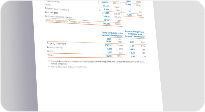MANAGEMENT DISCUSSION & ANALYSIS FINANCIAL REVIEW Investment Appraisal and Performance Review Net Assets Employed Capital Commitments(1) 2023 2022 2023 2022 HK$M HK$M HK$M HK$M Property investment 300,678 293,752 24,823 27,402 Property trading 17,334 11,612 – – Hotels 6,816 5,841 392 552 Total net assets employed 324,828 311,205 25,215 27,954 Less: net debt (36,679) (18,947) Less: non-controlling interests (3,067) (3,047) Equity attributable to the Company’s shareholders 285,082 289,211 Return on Average Equity Equity Attributable to the Attributable to the Company’s Shareholders(2) Company’s Shareholders(2) 2023 2022 HK$M HK$M 2023 2022 Property investment 276,512 279,688 1.0% 2.9% Property trading 3,038 3,992 -4.8% 3.9% Hotels 5,532 5,531 -1.8% -6.0% Total 285,082 289,211 0.9% 2.7% (1) The capital commitments represent the Group’s capital commitments plus the Group’s share of the capital commitments of joint venture companies. (2) Refer to Glossary on page 223 for definitions. 80