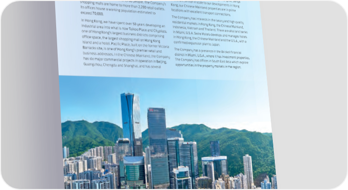SWIRE PROPERTIES ANNUAL REPORT 2023 Founded in Hong Kong in 1972, the Company is listed on projects under development in Beijing, Shanghai, Sanya The Stock Exchange of Hong Kong Limited and, with its and Xi’an. Similar in scale to our developments in Hong subsidiaries, employs around 5,700 people. The Company’s Kong, our Chinese Mainland properties are in prime shopping malls are home to more than 2,200 retail outlets. locations with excellent transport connections. Its offices house a working population estimated to The Company has interests in the luxury and high quality exceed 70,000. residential markets in Hong Kong, the Chinese Mainland, In Hong Kong, we have spent over 50 years developing an Indonesia, Vietnam and Thailand. There are also land banks industrial area into what is now Taikoo Place and Cityplaza, in Miami, U.S.A. Swire Hotels develops and manages hotels one of Hong Kong’s largest business districts comprising in Hong Kong, the Chinese Mainland and the U.S.A., with a office space, the largest shopping mall on Hong Kong confirmed expansion plan to Japan. Island and a hotel. Pacific Place, built on the former Victoria The Company has a presence in the Brickell financial Barracks site, is one of Hong Kong’s premier retail and district in Miami, U.S.A., where it has investment properties. business addresses. In the Chinese Mainland, the Company The Company has offices in South East Asia which explore has six major commercial projects in operation in Beijing, opportunities in the property markets in the region. Guangzhou, Chengdu and Shanghai, and has several 3