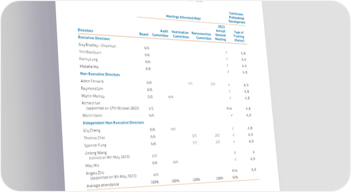 CORPORATE GOVERNANCE & SUSTAINABILITY CORPORATE GOVERNANCE Board Activities The Board met six times in 2023, including a strategy session. The attendance of individual Directors at meetings of the Board and its committees is set out in the table below. Attendance at Board meetings was 100%. All Directors attended Board meetings in person or through electronic means of communication during the year. Continuous Professional Meetings Attended/Held Development 2023 Annual Type of Audit Nomination Remuneration General Training Directors Board Committee Committee Committee Meeting (Notes) Executive Directors Guy Bradley – Chairman 6/6 √ A, B Tim Blackburn 6/6 √ A, B Fanny Lung 6/6 √ A, B Mabelle Ma 6/6 √ A, B Non-Executive Directors Adam Fenwick 6/6 1/1 2/2 √ A, B Raymond Lim 6/6 √ A, B Martin Murray 6/6 4/4 √ A, B Richard Sell (appointed on 17th October 2023) 1/1 N/A A, B Merlin Swire 6/6 √ A, B Independent Non-Executive Directors Lily Cheng 6/6 4/4 √ A, B Thomas Choi 6/6 1/1 2/2 √ A, B Spencer Fung 6/6 1/1 2/2 √ A, B Jinlong Wang (retired on 9th May 2023) 2/2 X A May Wu 6/6 4/4 √ A, B Angela Zhu (appointed on 9th May 2023) 4/4 N/A A, B Average attendance 100% 100% 100% 100% 92% Notes: A: Received training materials about matters relevant to their duties as Directors including on ESG. B: Attended training by external advisers about applicable laws and regulations and topics pertinent to the business of the Company. 96