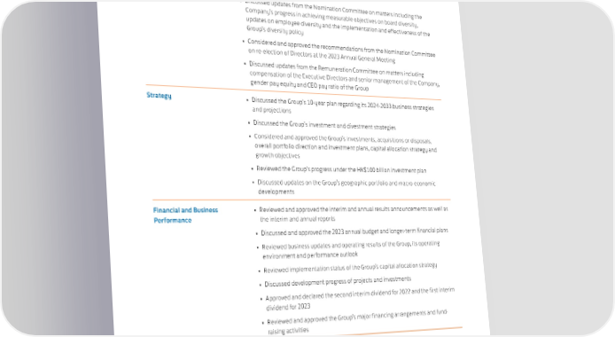 SWIRE PROPERTIES ANNUAL REPORT 2023 Key areas of activities of the Board during the year are summarised below. Leadership and People • Reviewed the structure, size, composition of the Board and the independence of the INEDs • Discussed updates from the Nomination Committee on matters including the Company’s progress in achieving measurable objectives on board diversity, updates on employee diversity and the implementation and effectiveness of the Group’s diversity policy • Considered and approved the recommendations from the Nomination Committee on re-election of Directors at the 2023 Annual General Meeting • Discussed updates from the Remuneration Committee on matters including compensation of the Executive Directors and senior management of the Company, gender pay equity and CEO pay ratio of the Group Strategy • Discussed the Group’s 10-year plan regarding its 2024-2033 business strategies and projections • Discussed the Group’s investment and divestment strategies • Considered and approved the Group’s investments, acquisitions or disposals, overall portfolio direction and investment plans, capital allocation strategy and growth objectives • Reviewed the Group’s progress under the HK$100 billion investment plan • Discussed updates on the Group’s geographic portfolio and macro-economic developments Financial and Business • Reviewed and approved the interim and annual results announcements as well as Performance the interim and annual reports • Discussed and approved the 2023 annual budget and longer-term financial plans • Reviewed business updates and operating results of the Group, its operating environment and performance outlook • Reviewed implementation status of the Group’s capital allocation strategy • Discussed development progress of projects and investments • Approved and declared the second interim dividend for 2022 and the first interim dividend for 2023 • Reviewed and approved the Group’s major financing arrangements and fund- raising activities 97