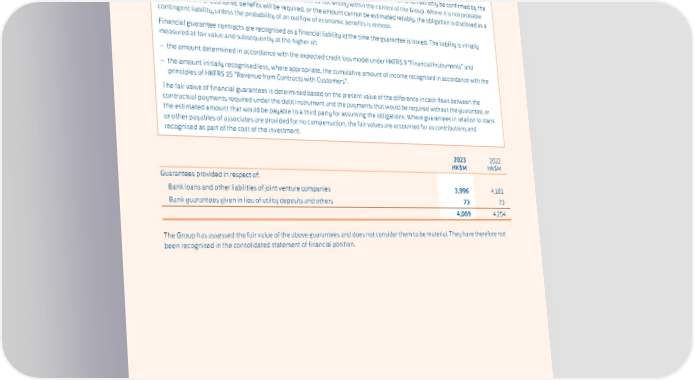 NOTES TO THE FINANCIAL STATEMENTS 38. Contingencies Accounting Policy Contingent liabilities are possible obligations that arise from past events and the existence of which will only be confirmed by the occurrence or non-occurrence of one or more future events not wholly within the control of the Group. Where it is not probable that an outflow of economic benefits will be required, or the amount cannot be estimated reliably, the obligation is disclosed as a contingent liability, unless the probability of an outflow of economic benefits is remote. Financial guarantee contracts are recognised as a financial liability at the time the guarantee is issued. The liability is initially measured at fair value and subsequently at the higher of: – the amount determined in accordance with the expected credit loss model under HKFRS 9 “Financial Instruments” and – the amount initially recognised less, where appropriate, the cumulative amount of income recognised in accordance with the principles of HKFRS 15 “Revenue from Contracts with Customers”. The fair value of financial guarantees is determined based on the present value of the difference in cash flows between the contractual payments required under the debt instrument and the payments that would be required without the guarantee, or the estimated amount that would be payable to a third party for assuming the obligations. Where guarantees in relation to loans or other payables of associates are provided for no compensation, the fair values are accounted for as contributions and recognised as part of the cost of the investment. 2023 2022 HK$M HK$M Guarantees provided in respect of: Bank loans and other liabilities of joint venture companies 3,996 4,181 Bank guarantees given in lieu of utility deposits and others 73 73 4,069 4,254 The Group has assessed the fair value of the above guarantees and does not consider them to be material. They have therefore not been recognised in the consolidated statement of financial position. 200