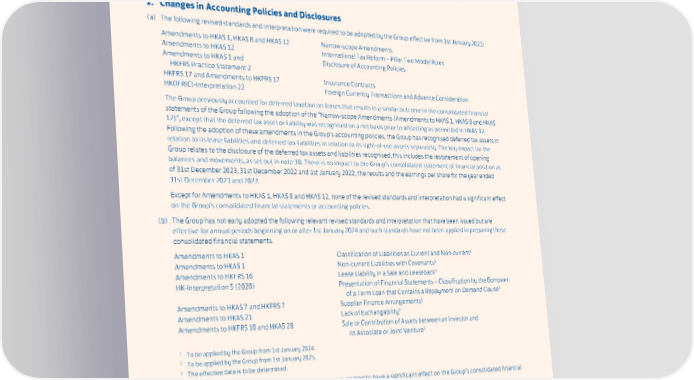NOTES TO THE FINANCIAL STATEMENTS General Information The Company is a limited liability company incorporated in Hong Kong and its shares are listed on The Stock Exchange of Hong Kong Limited. The principal activity of the Company is that of a holding company. The principal activities of its major subsidiary, joint venture and associated companies are shown on pages 208 to 210. 1. Changes in Accounting Policies and Disclosures (a) The following revised standards and interpretation were required to be adopted by the Group effective from 1st January 2023: Amendments to HKAS 1, HKAS 8 and HKAS 12 Narrow-scope Amendments Amendments to HKAS 12 International Tax Reform – Pillar Two Model Rules Amendments to HKAS 1 and Disclosure of Accounting Policies HKFRS Practice Statement 2 HKFRS 17 and Amendments to HKFRS 17 Insurance Contracts HK(IFRIC)-Interpretation 22 Foreign Currency Transactions and Advance Consideration The Group previously accounted for deferred taxation on leases that results in a similar outcome in the consolidated financial statements of the Group following the adoption of the “Narrow-scope Amendments (Amendments to HKAS 1, HKAS 8 and HKAS 12)”, except that the deferred tax asset or liability was recognised on a net basis prior to offsetting as permitted in HKAS 12. Following the adoption of these amendments in the Group’s accounting policies, the Group has recognised deferred tax assets in relation to its lease liabilities and deferred tax liabilities in relation to its right-of-use assets separately. The key impact for the Group relates to the disclosure of the deferred tax assets and liabilities recognised, this includes the restatement of opening balances and movements, as set out in note 30. There is no impact to the Group’s consolidated statement of financial position as of 31st December 2023, 31st December 2022 and 1st January 2022, the results and the earnings per share for the year ended 31st December 2023 and 2022. Except for Amendments to HKAS 1, HKAS 8 and HKAS 12, none of the revised standards and interpretation had a significant effect on the Group’s consolidated financial statements or accounting policies. (b) The Group has not early adopted the following relevant revised standards and interpretation that have been issued but are effective for annual periods beginning on or after 1st January 2024 and such standards have not been applied in preparing these consolidated financial statements. 1 Amendments to HKAS 1 Classification of Liabilities as Current and Non-current 1 Amendments to HKAS 1 Non-current Liabilities with Covenants Amendments to HKFRS 16 Lease Liability in a Sale and Leaseback1 HK-Interpretation 5 (2020) Presentation of Financial Statements – Classification by the Borrower 1 of a Term Loan that Contains a Repayment on Demand Clause 1 Amendments to HKAS 7 and HKFRS 7 Supplier Finance Arrangements 2 Amendments to HKAS 21 Lack of Exchangability Amendments to HKFRS 10 and HKAS 28 Sale or Contribution of Assets between an Investor and 3 its Associate or Joint Venture 1 To be applied by the Group from 1st January 2024. 2 To be applied by the Group from 1st January 2025. 3 The effective date is to be determined. None of these revised standards and interpretation are expected to have a significant effect on the Group’s consolidated financial statements. 147