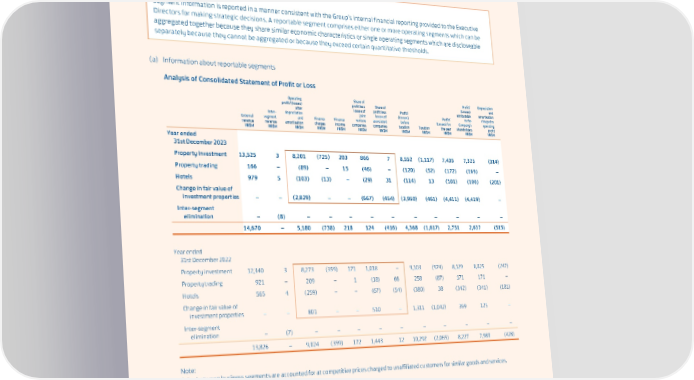 SWIRE PROPERTIES ANNUAL REPORT 2023 8. Segment Information The Group is organised on a divisional basis: Property investment, Property trading and Hotels. The reportable segments within each of the three divisions are classified according to the nature of the business. Accounting Policy Segment information is reported in a manner consistent with the Group’s internal financial reporting provided to the Executive Directors for making strategic decisions. A reportable segment comprises either one or more operating segments which can be aggregated together because they share similar economic characteristics or single operating segments which are discloseable separately because they cannot be aggregated or because they exceed certain quantitative thresholds. (a) Information about reportable segments Analysis of Consolidated Statement of Profit or Loss Operating Share of Profit/ Depreciation profit/(losses) profit less Share of (Losses) and Inter- after losses of profit less Profit/ attributable amortisation External segment depreciation joint losses of (Losses) Profit/ to the charged to revenue revenue and Finance Finance venture associated before (Losses) for Company’s operating HK$M HK$M amortisation charges income companies companies taxation Taxation the year shareholders profit HK$M HK$M HK$M HK$M HK$M HK$M HK$M HK$M HK$M HK$M Year ended 31st December 2023 Property investment 13,525 3 8,201 (725) 203 866 7 8,552 (1,117) 7,435 7,325 (314) Property trading 166 – (89) – 15 (46) – (120) (52) (172) (169) – Hotels 979 5 (103) (13) – (29) 31 (114) 13 (101) (100) (201) Change in fair value of investment properties – – (2,829) – – (667) (454) (3,950) (461) (4,411) (4,419) – Inter-segment elimination – (8) – – – – – – – – – – 14,670 – 5,180 (738) 218 124 (416) 4,368 (1,617) 2,751 2,637 (515) Year ended 31st December 2022 Property investment 12,340 3 8,273 (359) 171 1,018 – 9,103 (974) 8,129 8,025 (247) Property trading 921 – 209 – 1 (18) 66 258 (87) 171 171 – Hotels 565 4 (259) – – (67) (54) (380) 38 (342) (341) (181) Change in fair value of investment properties – – 801 – – 510 – 1,311 (1,042) 269 125 – Inter-segment elimination – (7) – – – – – – – – – – 13,826 – 9,024 (359) 172 1,443 12 10,292 (2,065) 8,227 7,980 (428) Note: Sales between business segments are accounted for at competitive prices charged to unaffiliated customers for similar goods and services. 155