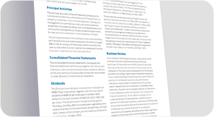 DIRECTORS’ REPORT The Directors submit their report together with the audited relevant share certificates must be lodged with the financial statements for the year ended 31st December Company’s share registrars, Computershare Hong Kong 2023, which are set out on pages 142 to 210. Investor Services Limited, 17th Floor, Hopewell Centre, 183 Queen’s Road East, Hong Kong, for registration not Principal Activities later than 4:30 p.m. on Wednesday, 3rd April 2024. The principal activities of Swire Properties Limited and its To facilitate the processing of proxy voting for the annual subsidiaries (collectively referred to as the “Group”) are: (i) general meeting to be held on 7th May 2024, the register of property investment, that is the development, leasing and members will be closed from 2nd May 2024 to 7th May 2024, management of commercial, retail and some residential both days inclusive, during which period no transfer of properties; (ii) property trading, that is the development and shares will be effected. In order to be entitled to attend and construction of properties, principally residential apartments, vote at the annual general meeting, all transfer forms for sale; and (iii) investment in and operation of hotels. accompanied by the relevant share certificates must be The principal activities of the Company’s principal subsidiary, lodged with the Company’s share registrars, Computershare joint venture and associated companies are shown on pages Hong Kong Investor Services Limited, 17th Floor, Hopewell 208 to 210. An analysis of the Group’s performance for the Centre, 183 Queen’s Road East, Hong Kong, for registration year by reportable business segment and geographical area not later than 4:30 p.m. on Tuesday, 30th April 2024. is set out in note 8 to the financial statements. Business Review Consolidated Financial Statements A fair review of the Group’s business, a description of the The consolidated financial statements incorporate the principal risks and uncertainties facing the Group, financial statements of the Group together with the Group’s particulars of important events affecting the Group that interests in joint venture and associated companies. Details have occurred since the end of the financial year and an of the joint venture and associated companies are provided indication of the likely future development of the Group’s in notes 20 and 21 to the financial statements. business (including, in each case to the extent necessary for an understanding of the development, performance or Dividends position of the Group’s business, key performance indicators) are provided in the sections of this annual The Directors have declared a second interim dividend of report headed Chairman’s Statement, Chief Executive’s HK$0.72 per share which, together with the first interim Statement, Key Business Strategies, Review of Operations, dividend of HK$0.33 per share paid in October 2023, Financial Review and Financing and in the notes to the amount to full year dividend of HK$1.05 (2022: HK$1.00) financial statements. To the extent necessary for an per share. The second interim dividend will be paid on understanding of the development, performance or Thursday, 2nd May 2024 to shareholders registered at the position of the Group’s business, a discussion of the Group’s close of business on the record date, being Friday, 5th April environmental policies and performance and an account of 2024. Shares of the Company will be traded ex-dividend as the Group’s key relationships with its employees, from Tuesday, 2nd April 2024. customers and suppliers and others that have a significant The Company’s dividend policy is to deliver sustainable impact on the Group and on which the Group’s success growth in dividends and to pay out approximately half of depends are provided in the section of this annual report our underlying profit in ordinary dividends over time. headed Sustainable Development, and a discussion of the Group’s compliance with the relevant laws and regulations Closure of Register of Members that have a significant impact on the Group is provided in the sections of this annual report headed Sustainable The register of members will be closed on Friday, 5th April Development, Corporate Governance, Risk Management 2024, during which day no transfer of shares will be and Directors’ Report. Detailed information on the Group’s effected. In order to qualify for entitlement to the second sustainability performance is provided in the Sustainability interim dividend, all transfer forms accompanied by the Report 2023 of the Company. 120