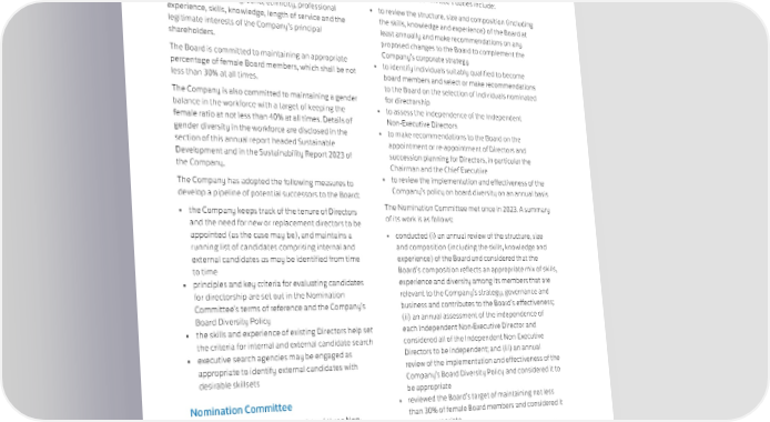 CORPORATE GOVERNANCE & SUSTAINABILITY CORPORATE GOVERNANCE In order to achieve a diversity of perspectives among The terms of reference of the Nomination Committee members of the Board, it is the policy of the Company to comply with the CG Code and are posted on the consider a number of factors when deciding on Company’s website. appointments to the Board and the continuation of those The Nomination Committee’s duties include: appointments. Such factors include gender, age, cultural and educational background, ethnicity, professional • to review the structure, size and composition (including experience, skills, knowledge, length of service and the the skills, knowledge and experience) of the Board at legitimate interests of the Company’s principal least annually and make recommendations on any shareholders. proposed changes to the Board to complement the The Board is committed to maintaining an appropriate Company’s corporate strategy percentage of female Board members, which shall be not • to identify individuals suitably qualified to become less than 30% at all times. board members and select or make recommendations to the Board on the selection of individuals nominated The Company is also committed to maintaining a gender for directorship balance in the workforce with a target of keeping the • to assess the independence of the Independent female ratio at not less than 40% at all times. Details of Non-Executive Directors gender diversity in the workforce are disclosed in the • to make recommendations to the Board on the section of this annual report headed Sustainable appointment or re-appointment of Directors and Development and in the Sustainability Report 2023 of succession planning for Directors, in particular the the Company. Chairman and the Chief Executive The Company has adopted the following measures to • to review the implementation and effectiveness of the develop a pipeline of potential successors to the Board: Company’s policy on board diversity on an annual basis • the Company keeps track of the tenure of Directors The Nomination Committee met once in 2023. A summary and the need for new or replacement directors to be of its work is as follows: appointed (as the case may be), and maintains a • conducted (i) an annual review of the structure, size running list of candidates comprising internal and and composition (including the skills, knowledge and external candidates as may be identified from time experience) of the Board and considered that the to time Board’s composition reflects an appropriate mix of skills, • principles and key criteria for evaluating candidates experience and diversity among its members that are for directorship are set out in the Nomination relevant to the Company’s strategy, governance and Committee’s terms of reference and the Company’s business and contributes to the Board’s effectiveness; Board Diversity Policy (ii) an annual assessment of the independence of • the skills and experience of existing Directors help set each Independent Non-Executive Director and the criteria for internal and external candidate search considered all of the Independent Non-Executive • executive search agencies may be engaged as Directors to be independent; and (iii) an annual appropriate to identify external candidates with review of the implementation and effectiveness of the desirable skillsets Company’s Board Diversity Policy and considered it to be appropriate Nomination Committee • reviewed the Board’s target of maintaining not less The Nomination Committee consists of three Non- than 30% of female Board members and considered it Executive Directors, Spencer Fung, Thomas Choi and Adam to be appropriate Fenwick. Two of the Committee members are Independent • made recommendations to the Board in respect of Non-Executive Directors, one of whom, Spencer Fung, is the proposed appointments of new Directors and the Chairman. All the members served for the whole of 2023. re-election of the Directors retiring at the 2023 Annual General Meeting 102