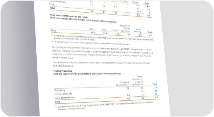 SWIRE PROPERTIES ANNUAL REPORT 2023 Investment Properties and Hotels Under Development or Held for Future Development (expected GFA attributable to the Group in million square feet) Residential/ Serviced Under Office Retail Hotels(1) Apartments Planning Total Hong Kong 0.2 – – – 0.8 1.0 Chinese Mainland 1.6 2.1 0.1 – 3.7 7.5 (2) U.S.A. – – – – 1.5 1.5 Total 1.8 2.1 0.1 – 6.0 10.0 Total Investment Properties and Hotels (GFA (or expected GFA) attributable to the Group in million square feet) Residential/ Serviced Under Office Retail Hotels(1) Apartments Planning Total Total 13.9 11.2 2.5 0.8 6.0 34.4 (1) Hotels are accounted for in the financial statements under property, plant and equipment and, where applicable, the leasehold land portion is accounted for under right-of-use assets. (2) This property is accounted for under properties held for development in the financial statements. The trading portfolio comprises completed units available for sale at EIGHT STAR STREET in Hong Kong and The River in Vietnam. There are nine residential projects under development, four in Hong Kong, two in the Chinese Mainland, one in Indonesia, one in Vietnam and one in Thailand. There is also a plan to develop a residential project on part of our land banks in Miami, U.S.A. The table below illustrates the GFA (or expected GFA) attributable to the Group of the trading property portfolio at 31st December 2023. Trading Properties (GFA (or expected GFA) attributable to the Group in million square feet) Under Development Completed or Held for Development(1) Development Total Hong Kong 0.0 1.1 1.1 Chinese Mainland – 0.5 0.5 U.S.A. and elsewhere 0.0 3.1 3.1 Total 0.0 4.7 4.7 (1) Completed development in Hong Kong comprises EIGHT STAR STREET and completed development in U.S.A. and elsewhere comprises The River in Vietnam. 35