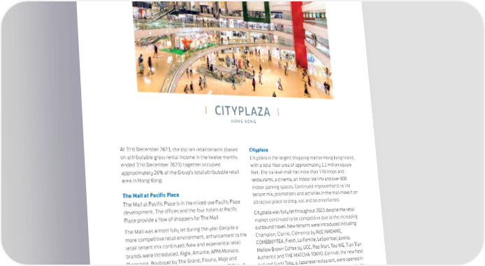 SWIRE PROPERTIES ANNUAL REPORT 2023 CITYPLAZA HONG KONG At 31st December 2023, the top ten retail tenants (based Cityplaza on attributable gross rental income in the twelve months Cityplaza is the largest shopping mall on Hong Kong Island, ended 31st December 2023) together occupied with a total floor area of approximately 1.1 million square approximately 26% of the Group’s total attributable retail feet. The six-level mall has more than 170 shops and area in Hong Kong. restaurants, a cinema, an indoor ice rink and over 800 The Mall at Pacific Place indoor parking spaces. Continued improvements to the tenant mix, promotions and activities in the mall make it an The Mall at Pacific Place is in the mixed-use Pacific Place attractive place to shop, eat and be entertained. development. The offices and the four hotels at Pacific Cityplaza was fully let throughout 2023 despite the retail Place provide a flow of shoppers for The Mall. market continued to be competitive due to the increasing The Mall was almost fully let during the year. Despite a outbound travel. New tenants were introduced including more competitive retail environment, enhancement to the Champion, Clarins, Clémence by RUE MADAME, retail tenant mix continued. New and experiential retail COMEBUYTEA, Fresh, La Famille, LeSportsac, Lovisa, brands were introduced. Aigle, Amante, APM Monaco, Mellow Brown Coffee by UCC, Pop Mart, Tea WG, Tian Tian Blancpain, Boutique by The Grand, Fleuria, Maje and Authentic and THE MATCHA TOKYO. Carnival, the new food Simply Toys became tenants. Louis Vuitton and Tiffany & hall and Sushi Taka, a Japanese restaurant, were opened in Co. had expansion. The premises occupied by Apinara Thai January 2023. Penna, a casual Italian dining restaurant was Cuisine and Bar, Balmain Paris, Brooks Brothers, Caviar opened in July. IKEA was opened in August and has House, JOYCE Beauty, MAX&Co. and Theory were refitted. introduced “Tai Koo Plan and Order Point” and Swedish bistro on ground floor. APiTA completed its last phase of renovation on basement floor by December 2023. 41