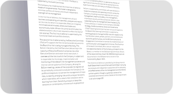 CORPORATE GOVERNANCE & SUSTAINABILITY RISK MANAGEMENT The Board has ultimate responsibility for risk management, issues are conducted by ExCom as appropriate. Matters of overseeing its design and implementation. The Board is significance that arise are reported as appropriate to the supported by the Audit Committee. Audit Committee and ultimately to the Board of Directors. The Company has implemented the three lines of defence ExCom is supported by committees with specialisation in model of risk governance. The model is designed to respective corporate and operating functions across the minimise conflicts of interest and ensure independent Company including investment appraisal, joint venture oversight of risk management. management, health and safety, crisis management, In the first line of defence, the management of each information security and data protection. ExCom is also business and operating unit identifies, analyses and reports supported by the risk management team headed by the on the risks for which it is responsible. Risks are mitigated, Finance Director. In relation to the Company’s SD 2030 minimised and eliminated, where practicable and Strategy, the Environmental, Social and Governance economically viable. Where risk cannot be eliminated, the (“ESG”) Steering Committee has been set up and reports to related economic returns are required to reflect the level of the Board. ESG Steering Committee is supported by risk retained. The first line of defence is supervised by the working groups to manage the ESG risks with respect to the functional heads and portfolio directors. five SD pillars: places, people, partners, environmental and economic performances; and the SD Communication & The second line of defence led by the Executive Committee Engagement Committee to oversee the implementation of (“ExCom”) supports the first line and provides assurance to communication and engagement initiatives. The Chairman the Board that risk is being managed effectively. The of the Audit Committee, who is also an independent ExCom chaired by the Chief Executive (also acting in the non-executive director of the Company and reports to the capacity of Executive Director) comprises two other Board, is a member of the ESG Steering Committee. Details Executive Directors and seven senior executives. It of the responsibilities of each SD 2030 Working Groups are oversees all the risks to which the Company is subject and documented in the SD Governance section of our is responsible for the design, implementation and Sustainability Report 2023. monitoring of the relevant risk management processes and The third line of defence is provided by the Group Internal internal control systems of the Company. Among the Audit Department to assist the Audit Committee in carrying ExCom meetings, review of the corporate risk register will out analysis and independent assessment of the adequacy be periodically conducted to evaluate the Company’s risk and effectiveness of the risk management and the internal profile and exposure, to oversee the management of major control systems through a systematic review of the risks, to identify emerging risks and to analyse risk events processes and internal control. Details of the scope of work which materialise, with a view to their resolution and to is set out on page 107. learning from them. Sensitivity analysis or deep dive sessions on contemporary risk area such as geopolitical 112