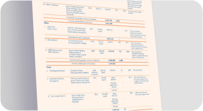 SWIRE PROPERTIES ANNUAL REPORT 2023 Completed properties for Leasehold Site area in Gross floor area Number of Year of investment in the Chinese Mainland Address expiry square feet in square feet car parks completion Remarks Retail (continued) 12. Metrolink in South of West Nanjing 2028 N/A 67,813 – 2018 Shopping corridor leased HKRI Taikoo Hui Road and underneath (part) from Shanghai Shentong Shi Men Yi Road, Jing’an Metro and operated by district, Shanghai HKRI Taikoo Hui, in which the Group owns a 50% interest. 13. Taikoo Li Qiantan East of Yangsi West Road, 2053 638,125 1,188,727 907 2020 The Group owns a 50% West of Dongyu Road, interest. North of Haiyang West Road, Pudong New district, Shanghai Total held through joint venture companies 3,242,716 1,764 – of which attributable to the Group 1,621,358 Office 1. Taikoo Hui North of Tianhe Road and 2051 526,941 1,693,125 – 2011 Floor area shown Towers 1 & 2 west of Tianhe East Road, (part) represents the office Tianhe district, Guangzhou portion, in which the Group owns a 97% interest. Total held through subsidiaries 1,693,125 – 2. ONE INDIGO 20 Jiuxianqiao Road, 2054 631,072 589,071 390 2011 Floor area shown Chaoyang district, Beijing (part) represents the office portion, in which the Group owns a 50% interest. 3. HKRI Centre 1 and South of West Nanjing 2059 676,091 1,900,838 798 2016 Floor area shown HKRI Centre 2 Road and east of (part) represents the office Shi Men Yi Road, Jing’an portion, in which the Group district, Shanghai owns a 50% interest. Total held through joint venture companies 2,489,909 1,188 – of which attributable to the Group 1,244,955 Hotel 1. The Opposite House 11 Sanlitun Road, 2044 566,332 169,463 32 2007 99-room hotel. Chaoyang district, Beijing (2054 for (part) car parks) 2. Mandarin Oriental, North of Tianhe Road and 2051 526,941 Hotel: – 2012 263-room hotel and Guangzhou west of Tianhe East Road, (part) 509,434 24 serviced apartments, Tianhe district, Guangzhou Serviced – in which the Group owns apartment: a 97% interest. 50,376 559,810 3. The Temple House Daci Temple Area, 2051 814,604 Hotel: – 2015 100-room hotel and 9 Dongda Street, (part) 193,137 42 serviced apartments. Jinjiang district, Serviced – Chengdu apartment: 106,804 299,941 Total held through subsidiaries 1,029,214 32 4. EAST Beijing 22 Jiuxianqiao Road, 2044 631,072 358,301 240 2012 365-room hotel, in which Chaoyang district, Beijing (2054 for (part) the Group owns a 50% office and interest. car parks) 217