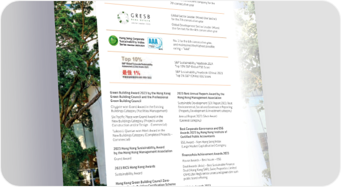 SWIRE PROPERTIES ANNUAL REPORT 2023 Ranked 2nd globally in the Real Estate Management and Development Industry Ranked 1st globally in the “Environmental Dimension” score DJSI World constituent company for the 7th consecutive year Global Sector Leader (Mixed Use Sector) for the 7th consecutive year sector leader 2023 Global Development Sector Leader (Mixed Use Sector) for the 4th consecutive year No. 1 for the 6th consecutive year, and maintained the highest possible 2023-2024 rating – “AAA” S&P Sustainability Yearbook 2024 Top 10% S&P Global ESG Score S&P Sustainability Yearbook (China) 2023 Top 1% S&P (China) ESG Score Green Building Award 2023 by the Hong Kong 2023 Best Annual Reports Award by the Green Building Council and the Professional Hong Kong Management Association Green Building Council Sustainable Development (SD) Report 2022: Best Citygate won Grand Award in the Existing Environmental, Social and Governance Reporting Buildings Category (Facilities Management) (Property Development & Investment category) Six Pacific Place won Grand Award in the Annual Report 2022: Silver Award New Buildings Category (Projects under (General category) Construction and/or Design – Commercial) Taikoo Li Qiantan won Merit Award in the Best Corporate Governance and ESG New Buildings Category (Completed Projects – Awards 2023 by Hong Kong Institute of Commercial) Certified Public Accountants ESG Award – Non-Hang Seng Index 2023 Hong Kong Sustainability Award (Large Market Capitalisation) Category by the Hong Kong Management Association Grand Award FinanceAsia Achievement Awards 2023 House Awards – Best Issuer – ESG 2023 RICS Hong Kong Awards Deal Awards (Asia) – Best Sustainable Finance Sustainability Award Deal (Hong Kong SAR), Swire Properties Limited CNH3.2bn RegS senior unsecured green dim sum Hong Kong Green Building Council Zero- public bond offering Carbon-Ready Building Certification Scheme 17 buildings certified under the newly launched IFR Asia Awards 2023 scheme in 2023 Country awards – Renminbi Bond, Swire Properties’ RMB3.2bn dual-tranche green dim 2023 Randstad Employer Brand Awards sum bond Top 5 Most Attractive Employers in Hong Kong The Asset Triple A Sustainable Finance 2023 Gender Equality Global Report & Ranking Awards 2024 by Equileap Best Green Bond – Real Estate (Hong Kong SAR), Top 10 List Swire Properties CNH3.2bn dual-tranche green dim sum bond 9