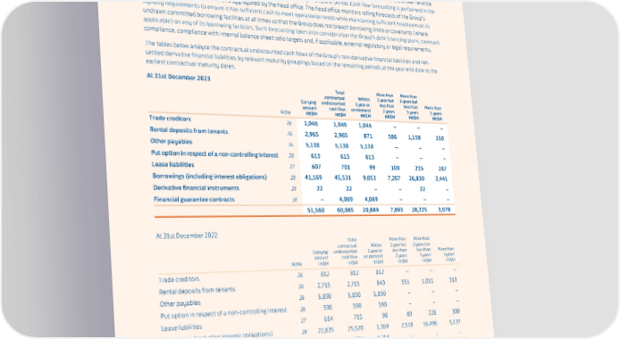 SWIRE PROPERTIES ANNUAL REPORT 2023 2. Financial Risk Management (continued) (iv) Liquidity exposure The Group takes liquidity risk into consideration when deciding its sources of funds and their tenors, so as to avoid over reliance on funds from any one source and to prevent substantial refinancing in any one period. Cash flow forecasting is performed in the operating entities of the Group and aggregated by the head office. The head office monitors rolling forecasts of the Group’s liquidity requirements to ensure it has sufficient cash to meet operational needs while maintaining sufficient headroom on its undrawn committed borrowing facilities at all times so that the Group does not breach borrowing limits or covenants (where applicable) on any of its borrowing facilities. Such forecasting takes into consideration the Group’s debt financing plans, covenant compliance, compliance with internal balance sheet ratio targets and, if applicable, external regulatory or legal requirements. The tables below analyse the contractual undiscounted cash flows of the Group’s non-derivative financial liabilities and net- settled derivative financial liabilities by relevant maturity groupings based on the remaining periods at the year-end date to the earliest contractual maturity dates. At 31st December 2023 Total More than More than contractual Within 1 year but 2 years but Carrying undiscounted 1 year or less than less than More than Note amount cash flow on demand 2 years 5 years 5 years HK$M HK$M HK$M HK$M HK$M HK$M Trade creditors 26 1,046 1,046 1,046 – – – Rental deposits from tenants 26 2,965 2,965 871 586 1,158 350 Other payables 26 5,138 5,138 5,138 – – – Put option in respect of a non-controlling interest 26 613 613 613 – – – Lease liabilities 27 607 701 99 100 215 287 Borrowings (including interest obligations) 28 41,169 45,531 9,053 7,207 26,830 2,441 Derivative financial instruments 29 22 22 – – 22 – Financial guarantee contracts 38 – 4,069 4,069 – – – 51,560 60,085 20,889 7,893 28,225 3,078 At 31st December 2022 Total More than More than contractual Within 1 year but 2 years but Carrying undiscounted 1 year or less than less than More than Note amount cash flow on demand 2 years 5 years 5 years HK$M HK$M HK$M HK$M HK$M HK$M Trade creditors 26 812 812 812 – – – Rental deposits from tenants 26 2,715 2,715 840 551 1,011 313 Other payables 26 5,890 5,890 5,890 – – – Put option in respect of a non-controlling interest 26 590 590 590 – – – Lease liabilities 27 614 715 98 89 228 300 Borrowings (including interest obligations) 28 22,835 25,520 1,369 2,518 16,496 5,137 Financial guarantee contracts 38 – 4,254 4,254 – – – 33,456 40,496 13,853 3,158 17,735 5,750 151