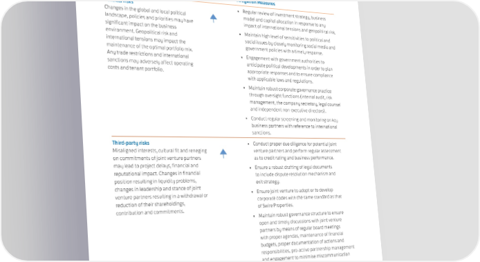 CORPORATE GOVERNANCE & SUSTAINABILITY RISK MANAGEMENT Existing Risks and Possible Impacts Risk Trend Mitigation Measures Political risks • Regular review of investment strategy, business Changes in the global and local political model and capital allocation in response to any landscape, policies and priorities may have impact of international tensions and geopolitical risk. significant impact on the business • Maintain high level of sensitivities to political and environment. Geopolitical risk and social issues by closely monitoring social media and international tensions may impact the government policies with a timely response. maintenance of the optimal portfolio mix. • Engagement with government authorities to Any trade restrictions and international anticipate political developments in order to plan sanctions may adversely affect operating appropriate responses and to ensure compliance costs and tenant portfolio. with applicable laws and regulations. • Maintain robust corporate governance practice through oversight functions (internal audit, risk management, the company secretary, legal counsel and independent non-executive directors). • Conduct regular screening and monitoring on key business partners with reference to international sanctions. Third-party risks • Conduct proper due diligence for potential joint Misaligned interests, cultural fit and reneging venture partners and perform regular assessment on commitments of joint venture partners as to credit rating and business performance. may lead to project delays, financial and • Ensure a robust drafting of legal documents reputational impact. Changes in financial to include dispute resolution mechanism and position resulting in liquidity problems, exit strategy. changes in leadership and stance of joint • Ensure joint venture to adopt or to develop venture partners resulting in a withdrawal or corporate codes with the same standard as that reduction of their shareholdings, of Swire Properties. contribution and commitments. • Maintain robust governance structure to ensure open and timely discussions with joint venture partners by means of regular board meetings with proper agendas, maintenance of financial budgets, proper documentation of actions and responsibilities, pro-active partnership management and engagement to minimise miscommunication or disputes. 116