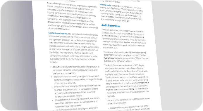 SWIRE PROPERTIES ANNUAL REPORT 2023 Management structure: The Group has a clear The Company has in place effective processes and systems organisational structure that, to the extent required, for the identification, capture and reporting of operational, delegates the day-to-day responsibility for the design, financial and compliance-related information in a form and documentation and implementation of procedures and time-frame intended to ensure that staff carry out their monitoring of risk. Individuals appreciate where they will be designated responsibilities. held accountable in this process. Internal audit: Independent of management, the Group A control self-assessment process requires management to Internal Audit Department (“GIAD”) reports directly to the assess, through the use of detailed questionnaires, the Audit Committee and performs regular reviews of key risk adequacy and effectiveness of risk management and areas and monitors compliance with Group accounting, internal controls over the reliability of financial reporting, financial and operational procedures. The role of GIAD is the effectiveness and efficiency of operations and discussed further on pages 106 to 107. compliance with applicable laws and regulations. This process and its results are reviewed by internal auditors Audit Committee and form part of the Audit Committee’s annual assessment The Audit Committee, consisting of three Non-Executive of control effectiveness. Directors, May Wu, Lily Cheng and Martin Murray, assists Controls and review: The control environment comprises the Board in discharging its responsibilities for corporate policies and procedures intended to ensure that relevant governance and financial reporting. Two of the Committee management directives are carried out and actions that members are Independent Non-Executive Directors, one of may be needed to address risks are taken. These may whom, May Wu, is Chairman. All the members served for include approvals and verifications, reviews, safeguarding the whole of 2023. of assets and segregation of duties. Control activities can The terms of reference of the Audit Committee follow the be divided into operations, financial reporting and guidelines set out by the Hong Kong Institute of Certified compliance, although there may, on occasion, be some Public Accountants and comply with the CG Code. They are overlap between them. The typical control activities available on the Company’s website. include: • analytical reviews: for example, conducting reviews of The Audit Committee met four times in 2023. Regular actual performance versus budgets, forecasts, prior attendees at the meetings are the Finance Director, periods and competitors the Financial Controller, the Group Head of Internal Audit, • direct functional or activity management: reviews of the Digital and IT Director and the external auditors. performance reports, conducted by managers in charge The Audit Committee meets at least twice a year with the of functions or activities external auditors, and at least once a year with the Group • information-processing: performing controls intended Head of Internal Audit, in each case without the presence to check the authorisation of transactions and the of management. Each meeting receives written reports accuracy and completeness of their reporting, from the external auditors and GIAD. The external valuer for example, exception reports (Cushman & Wakefield Limited) also attended two of the • physical controls: ensuring equipment, inventories, meetings. securities and other assets are safeguarded and The work of the Committee during 2023 included reviews subjected to periodic checks of the following matters: • performance indicators: carrying out analyses of • the completeness, accuracy and integrity of formal different sets of data, operational and financial, announcements relating to the Group’s performance examining the relationships between them, and taking including the 2022 annual and 2023 interim reports and corrective action where necessary announcements, with recommendations to the Board • segregation of duties: dividing and segregating duties for approval among different people, with a view to strengthening • the Group’s compliance with regulatory and statutory checks and minimising the risk of errors and abuse requirements 105