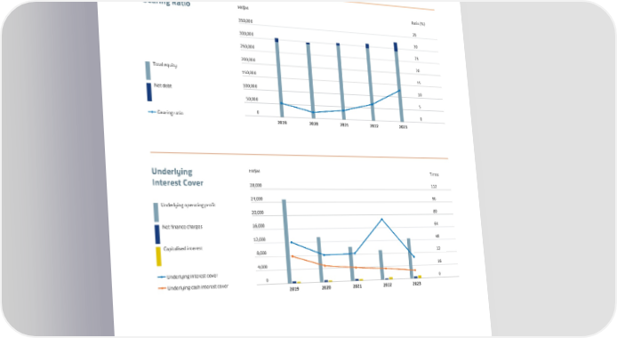 SWIRE PROPERTIES ANNUAL REPORT 2023 Gearing Ratio and Interest Cover The following graphs illustrate the gearing ratio and underlying interest cover for each of the last five years: Gearing Ratio HK$M Ratio (%) 350,000 35 300,000 30 250,000 25 200,000 20 Total equity 150,000 15 Net debt 100,000 10 50,000 5 Gearing ratio 0 0 2019 2020 2021 2022 2023 Underlying HK$M Times Interest Cover 28,000 112 24,000 96 Underlying operating profit 20,000 80 Net finance charges 16,000 64 12,000 48 Capitalised interest 8,000 32 4,000 16 Underlying interest cover Underlying cash interest cover 0 0 2019 2020 2021 2022 2023 87