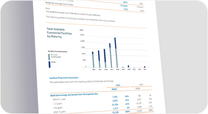 MANAGEMENT DISCUSSION & ANALYSIS FINANCING Maturity Profile and Refinancing Bank loans and other borrowings are repayable on various dates up to 2033 (2022: up to 2030). The weighted average term and cost of the Group’s debt are: 2023 2022 Weighted average term of debt 3.0 years 3.9 years Weighted average cost of debt 4.1% 3.2% Note: The weighted average cost of debt above is stated on gross debt basis. The maturity profile of the Group’s available committed facilities is set out below: Total Available HK$M Committed Facilities 15,000 by Maturity 12,000 9,000 Facilities from third parties 6,000 Term and revolving loans 3,000 Bonds 0 2024 2025 2026 2027 2028 2029 2030 2031 2032 2033 Audited Financial Information The table below sets forth the maturity profile of the Group’s borrowings: 2023 2022 HK$M HK$M Bank borrowings and bonds from third parties due Within 1 year 7,563 18% 700 3% 1-2 years 6,073 15% 1,875 8% 2-5 years 25,256 61% 15,195 67% After 5 years 2,277 6% 5,065 22% Total 41,169 100% 22,835 100% Less: Amount due within one year included under current liabilities 7,563 700 Amount due after one year included under non-current liabilities 33,606 22,135 84