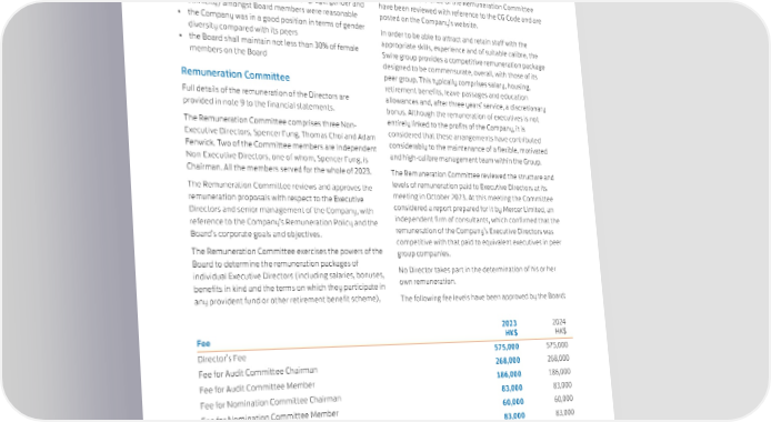 SWIRE PROPERTIES ANNUAL REPORT 2023 The Nomination Committee assessed the Board’s diversity taking into consideration salaries paid by comparable by reviewing a comparison against industry and peer group companies, time commitments and responsibilities and companies, and the relevant experience and skillsets of the employment conditions elsewhere in the Group. Directors. The Committee considered that: The terms of reference of the Remuneration Committee • the ratios for the objective criteria (e.g. age, gender and have been reviewed with reference to the CG Code and are ethnicity) amongst Board members were reasonable posted on the Company’s website. • the Company was in a good position in terms of gender In order to be able to attract and retain staff with the diversity compared with its peers appropriate skills, experience and of suitable calibre, the • the Board shall maintain not less than 30% of female Swire group provides a competitive remuneration package members on the Board designed to be commensurate, overall, with those of its Remuneration Committee peer group. This typically comprises salary, housing, retirement benefits, leave-passages and education Full details of the remuneration of the Directors are allowances and, after three years’ service, a discretionary provided in note 9 to the financial statements. bonus. Although the remuneration of executives is not The Remuneration Committee comprises three Non- entirely linked to the profits of the Company, it is Executive Directors, Spencer Fung, Thomas Choi and Adam considered that these arrangements have contributed Fenwick. Two of the Committee members are Independent considerably to the maintenance of a flexible, motivated Non-Executive Directors, one of whom, Spencer Fung, is and high-calibre management team within the Group. Chairman. All the members served for the whole of 2023. The Remuneration Committee reviewed the structure and The Remuneration Committee reviews and approves the levels of remuneration paid to Executive Directors at its remuneration proposals with respect to the Executive meeting in October 2023. At this meeting the Committee Directors and senior management of the Company, with considered a report prepared for it by Mercer Limited, an reference to the Company’s Remuneration Policy and the independent firm of consultants, which confirmed that the Board’s corporate goals and objectives. remuneration of the Company’s Executive Directors was competitive with that paid to equivalent executives in peer The Remuneration Committee exercises the powers of the group companies. Board to determine the remuneration packages of No Director takes part in the determination of his or her individual Executive Directors (including salaries, bonuses, own remuneration. benefits in kind and the terms on which they participate in any provident fund or other retirement benefit scheme), The following fee levels have been approved by the Board: 2023 2024 Fee HK$ HK$ Director’s Fee 575,000 575,000 Fee for Audit Committee Chairman 268,000 268,000 Fee for Audit Committee Member 186,000 186,000 Fee for Nomination Committee Chairman 83,000 83,000 Fee for Nomination Committee Member 60,000 60,000 Fee for Remuneration Committee Chairman 83,000 83,000 Fee for Remuneration Committee Member 60,000 60,000 Details of emoluments paid to each Director in 2023 are set out in note 9 to the financial statements. 103