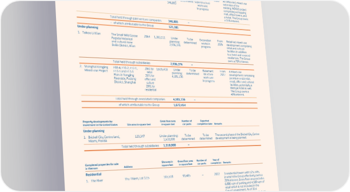 SCHEDULE OF PRINCIPAL GROUP PROPERTIES At 31st December 2023 Property developments Expected for investment in the Leasehold Site area in Gross floor area Number of Stage of completion Chinese Mainland Address expiry square feet in square feet car parks completion date Remarks Hotel 1. INDIGO Phase Two, Next to and on the east 2060 842,807 Under To be Basement and 2026 An office-led, mixed-use Beijing – of current INDIGO, (part) planning: determined superstructure extension of the hotel portion Beijing 346,803 works are existing INDIGO project in progress comprising a shopping mall, office towers, and a hotel. The Group owns a 35% interest. Total held through joint venture companies 346,803 – – of which attributable to the Group 121,381 Under planning 1. Taikoo Li Xi’an The Small Wild Goose 2064 1,383,111 Under To be Excavation From Retail-led mixed-use Pagoda historical planning: determined works in 2026 development comprising and cultural zone 2,936,376 progress retail and cultural Beilin District, Xi’an facilities in addition to a hotel and serviced residences. The Group owns a 70% interest. Total held through subsidiaries 2,936,376 – 2. Shanghai Yangjing E08-4, E10-2, E12-1, 2061 for 1,635,418 Under To be Basement From A mixed-use Mixed-use Project E13-1 and E13-3 retail planning: determined structure 2027 development comprising Plots in Yangjing 2071 for 4,181,136 works are premium residential, Riverside, Pudong office and in progress retail, office and cultural District, Shanghai culture facilities, potentially a 2091 for lifestyle hotel as well. residential The Group owns a 40% interest. Total held through associated companies 4,181,136 – – of which attributable to the Group 1,672,454 Property developments for Gross floor area Number of Expected investment in the United States Site area in square feet in square feet car parks completion date Remarks Under planning 1. Brickell City Centre land, 123,347 Under planning: To be To be The second phase of the Brickell City Centre Miami, Florida 1,510,000 determined determined development is being planned. Total held through subsidiaries 1,510,000 – Completed properties for sale Site area in Gross floor area Number of Year of in Vietnam Address square feet in square feet car parks completion Remarks Residential 1. The River Thu Thiem, Lot 3.15 165,518 93,485 – 2022 3 residential towers with 525 units, in which the Group effectively owns a 20% interest. Gross floor area excludes 6,886 sqm of parking and 4,500 sqm of retail which is not included in the Group’s investment. As of 31st December 2023, sales of 467 units had been closed. Floor area shown represents the gross floor area of the remaining 58 residential units. Total held through associated companies 93,485 – – of which attributable to the Group 18,697 220