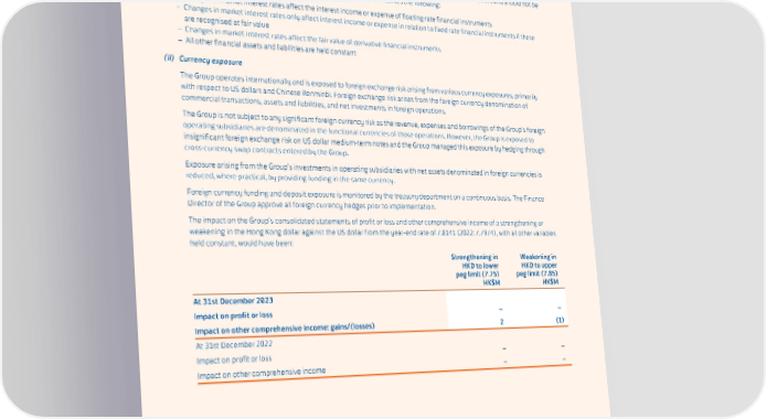 SWIRE PROPERTIES ANNUAL REPORT 2023 2. Financial Risk Management (continued) (i) Interest rate exposure (continued) This analysis is based on a hypothetical situation, as in practice market interest rates rarely change in isolation, and should not be considered a projection of likely future profit or losses. The analysis assumes the following: – Changes in market interest rates affect the interest income or expense of floating rate financial instruments – Changes in market interest rates only affect interest income or expense in relation to fixed rate financial instruments if these are recognised at fair value – Changes in market interest rates affect the fair value of derivative financial instruments – All other financial assets and liabilities are held constant (ii) Currency exposure The Group operates internationally and is exposed to foreign exchange risk arising from various currency exposures, primarily with respect to US dollars and Chinese Renminbi. Foreign exchange risk arises from the foreign currency denomination of commercial transactions, assets and liabilities, and net investments in foreign operations. The Group is not subject to any significant foreign currency risk as the revenue, expenses and borrowings of the Group’s foreign operating subsidiaries are denominated in the functional currencies of those operations. However, the Group is exposed to insignificant foreign exchange risk on US dollar medium-term notes and the Group managed this exposure by hedging through cross-currency swap contracts entered by the Group. Exposure arising from the Group’s investments in operating subsidiaries with net assets denominated in foreign currencies is reduced, where practical, by providing funding in the same currency. Foreign currency funding and deposit exposure is monitored by the treasury department on a continuous basis. The Finance Director of the Group approve all foreign currency hedges prior to implementation. The impact on the Group’s consolidated statements of profit or loss and other comprehensive income of a strengthening or weakening in the Hong Kong dollar against the US dollar from the year-end rate of 7.8141 (2022: 7.7974), with all other variables held constant, would have been: Strengthening in Weakening in HKD to lower HKD to upper peg limit (7.75) peg limit (7.85) HK$M HK$M At 31st December 2023 Impact on profit or loss – – Impact on other comprehensive income: gains/(losses) 2 (1) At 31st December 2022 Impact on profit or loss – – Impact on other comprehensive income – – 149
