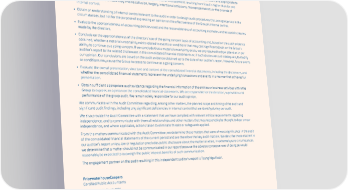 SWIRE PROPERTIES ANNUAL REPORT 2023 As part of an audit in accordance with HKSAs, we exercise professional judgement and maintain professional scepticism throughout the audit. We also: • Identify and assess the risks of material misstatement of the consolidated financial statements, whether due to fraud or error, design and perform audit procedures responsive to those risks, and obtain audit evidence that is sufficient and appropriate to provide a basis for our opinion. The risk of not detecting a material misstatement resulting from fraud is higher than for one resulting from error, as fraud may involve collusion, forgery, intentional omissions, misrepresentations or the override of internal control. • Obtain an understanding of internal control relevant to the audit in order to design audit procedures that are appropriate in the circumstances, but not for the purpose of expressing an opinion on the effectiveness of the Group’s internal control. • Evaluate the appropriateness of accounting policies used and the reasonableness of accounting estimates and related disclosures made by the directors. • Conclude on the appropriateness of the directors’ use of the going concern basis of accounting and, based on the audit evidence obtained, whether a material uncertainty exists related to events or conditions that may cast significant doubt on the Group’s ability to continue as a going concern. If we conclude that a material uncertainty exists, we are required to draw attention in our auditor’s report to the related disclosures in the consolidated financial statements or, if such disclosures are inadequate, to modify our opinion. Our conclusions are based on the audit evidence obtained up to the date of our auditor’s report. However, future events or conditions may cause the Group to cease to continue as a going concern. • Evaluate the overall presentation, structure and content of the consolidated financial statements, including the disclosures, and whether the consolidated financial statements represent the underlying transactions and events in a manner that achieves fair presentation. • Obtain sufficient appropriate audit evidence regarding the financial information of the entities or business activities within the Group to express an opinion on the consolidated financial statements. We are responsible for the direction, supervision and performance of the group audit. We remain solely responsible for our audit opinion. We communicate with the Audit Committee regarding, among other matters, the planned scope and timing of the audit and significant audit findings, including any significant deficiencies in internal control that we identify during our audit. We also provide the Audit Committee with a statement that we have complied with relevant ethical requirements regarding independence, and to communicate with them all relationships and other matters that may reasonably be thought to bear on our independence, and where applicable, actions taken to eliminate threats or safeguards applied. From the matters communicated with the Audit Committee, we determine those matters that were of most significance in the audit of the consolidated financial statements of the current period and are therefore the key audit matters. We describe these matters in our auditor’s report unless law or regulation precludes public disclosure about the matter or when, in extremely rare circumstances, we determine that a matter should not be communicated in our report because the adverse consequences of doing so would reasonably be expected to outweigh the public interest benefits of such communication. The engagement partner on the audit resulting in this independent auditor’s report is Tsang Nga Kwan. PricewaterhouseCoopers Certified Public Accountants Hong Kong, 14th March 2024 141