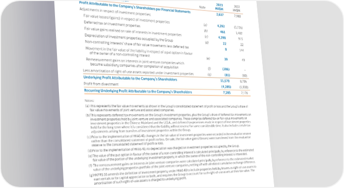SWIRE PROPERTIES ANNUAL REPORT 2023 2023 2022 Underlying Profit Reconciliation Note HK$M HK$M Profit Attributable to the Company’s Shareholders per Financial Statements 2,637 7,980 Adjustments in respect of investment properties: Fair value losses/(gains) in respect of investment properties (a) 4,392 (1,726) Deferred tax on investment properties (b) 461 1,402 Fair value gains realised on sale of interests in investment properties (c) 4,398 915 Depreciation of investment properties occupied by the Group (d) 22 22 Non-controlling interests’ share of fair value movements less deferred tax 8 144 Movement in the fair value of the liability in respect of a put option in favour of the owner of a non-controlling interest (e) 39 49 Remeasurement gains on interests in joint venture companies which became subsidiary companies after completion of acquisition (f) (306) – Less amortisation of right-of-use assets reported under investment properties (g) (81) (80) Underlying Profit Attributable to the Company’s Shareholders 11,570 8,706 Profit from divestment (4,285) (1,530) Recurring Underlying Profit Attributable to the Company’s Shareholders 7,285 7,176 Notes: (a) This represents the fair value movements as shown in the Group’s consolidated statement of profit or loss and the Group’s share of fair value movements of joint venture and associated companies. (b) This represents deferred tax movements on the Group’s investment properties, plus the Group’s share of deferred tax movements on investment properties held by joint venture and associated companies. These comprise deferred tax on fair value movements on investment properties in the Chinese Mainland and the U.S.A., and deferred tax provisions made in respect of investment properties held for the long-term where it is considered that the liability will not reverse for some considerable time. It also includes certain tax adjustments arising from transfers of investment properties within the Group. (c) Prior to the implementation of HKAS 40, changes in the fair value of investment properties were recorded in the revaluation reserve rather than the consolidated statement of profit or loss. On sale, the fair value gains/(losses) were transferred from the revaluation reserve to the consolidated statement of profit or loss. (d) Prior to the implementation of HKAS 40, no depreciation was charged on investment properties occupied by the Group. (e) The value of the put option in favour of the owner of a non-controlling interest is calculated principally by reference to the estimated fair value of the portion of the underlying investment property in which the owner of the non-controlling interest is interested. (f) The remeasurement gains on interests in joint venture companies were calculated principally by reference to the estimated market value of the underlying properties portfolio of the joint venture companies, netting off with all related cumulative exchange difference. (g) HKFRS 16 amends the definition of investment property under HKAS 40 to include properties held by lessees as right-of-use assets to earn rentals or for capital appreciation or both, and requires the Group to account for such right-of-use assets at their fair value. The amortisation of such right-of-use assets is charged to underlying profit. 29