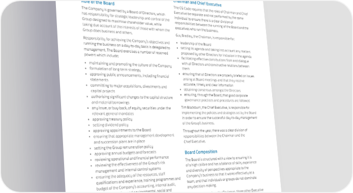 SWIRE PROPERTIES ANNUAL REPORT 2023 The Board of Directors Chairman and Chief Executive Role of the Board The CG Code requires that the roles of Chairman and Chief The Company is governed by a Board of Directors, which Executive be separate and not performed by the same has responsibility for strategic leadership and control of the individual to ensure there is a clear division of Group designed to maximise shareholder value, while responsibilities between the running of the Board and the taking due account of the interests of those with whom the executives who run the business. Group does business and others. Guy Bradley, the Chairman, is responsible for: Responsibility for achieving the Company’s objectives and • leadership of the Board running the business on a day-to-day basis is delegated to • setting its agenda and taking into account any matters management. The Board exercises a number of reserved proposed by other Directors for inclusion in the agenda powers which include: • facilitating effective contributions from and dialogue • maintaining and promoting the culture of the Company with all Directors and constructive relations between • formulation of long-term strategy them • approving public announcements, including financial • ensuring that all Directors are properly briefed on issues statements arising at Board meetings and that they receive • committing to major acquisitions, divestments and accurate, timely and clear information capital projects • obtaining consensus amongst the Directors • authorising significant changes to the capital structure • ensuring, through the Board, that good corporate and material borrowings governance practices and procedures are followed • any issue, or buy-back, of equity securities under the Tim Blackburn, the Chief Executive, is responsible for relevant general mandates implementing the policies and strategies set by the Board • approving treasury policy in order to ensure the successful day-to-day management • setting dividend policy of the Group’s business. • approving appointments to the Board Throughout the year, there was a clear division of • ensuring that appropriate management development responsibilities between the Chairman and the and succession plans are in place Chief Executive. • setting the Group remuneration policy • approving annual budgets and forecasts Board Composition • reviewing operational and financial performance The Board is structured with a view to ensuring it is • reviewing the effectiveness of the Group’s risk of a high calibre and has a balance of skills, experience management and internal control systems and diversity of perspectives appropriate to the • ensuring the adequacy of the resources, staff Company’s business so that it works effectively as a qualifications and experience, training programmes and team, and that individuals or groups do not dominate budget of the Company’s accounting, internal audit, any decision-making. financial reporting and environmental, social and governance (“ESG”) functions The Board comprises the Chairman, three other Executive • overseeing sustainable development matters Directors and ten Non-Executive Directors. Their To assist it in fulfilling its duties, the Board has three biographical details are set out in the section of this annual primary committees, the Audit Committee (see pages 105 report headed Directors and Officers and are posted on the to 106), the Nomination Committee (see pages 102 to 103) Company’s website. and the Remuneration Committee (see page 103). 93