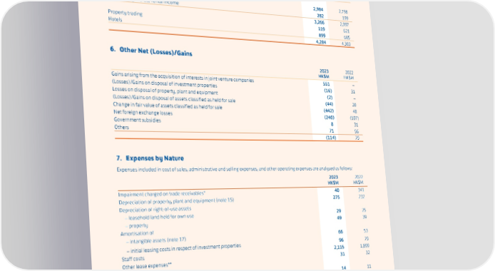 NOTES TO THE FINANCIAL STATEMENTS 5. Cost of Sales 2023 2022 HK$M HK$M Direct rental outgoings in respect of investment properties that – generated rental income 2,984 2,798 – did not generate rental income 282 199 3,266 2,997 Property trading 119 621 Hotels 899 685 4,284 4,303 6. Other Net (Losses)/Gains 2023 2022 HK$M HK$M Gains arising from the acquisition of interests in joint venture companies 551 – (Losses)/Gains on disposal of investment properties (16) 31 Losses on disposal of property, plant and equipment (2) – (Losses)/Gains on disposal of assets classified as held for sale (44) 20 Change in fair value of assets classified as held for sale (442) 48 Net foreign exchange losses (240) (107) Government subsidies 8 31 Others 71 56 (114) 79 7. Expenses by Nature Expenses included in cost of sales, administrative and selling expenses, and other operating expenses are analysed as follows: 2023 2022 HK$M HK$M Impairment charged on trade receivables* 40 341 Depreciation of property, plant and equipment (note 15) 275 232 Depreciation of right-of-use assets – leasehold land held for own use 29 25 – property 49 39 Amortisation of – intangible assets (note 17) 66 53 – initial leasing costs in respect of investment properties 96 79 Staff costs 2,115 1,899 Other lease expenses** 31 32 Auditors’ remuneration – audit services 14 11 – tax services 2 3 – other services 4 3 * These impairments include expected credit losses on the operating lease receivables in relation to the forgiveness of lease payments, i.e. rent concessions granted to tenants during the year, under HKFRS 9 of HK$36 million (2022: HK$319 million). ** These expenses relate to short-term leases and leases of low-value assets. They are directly charged to the consolidated statement of profit or loss and are not included in the measurement of lease liabilities under HKFRS 16. 154
