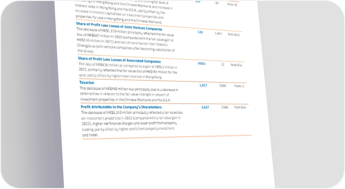 MANAGEMENT DISCUSSION & ANALYSIS FINANCIAL REVIEW Consolidated Statement of Profit or Loss (continued) 2023 2022 HK$M HK$M Reference Net Finance Charges 520 187 Note 10 The increase of HK$333 million principally due to a higher level of borrowings in Hong Kong and the Chinese Mainland, and increase in interest rates in Hong Kong and the U.S.A., partly offset by the increase in interest capitalised on investment properties and properties for sale in Hong Kong and the Chinese Mainland. Share of Profit Less Losses of Joint Venture Companies 124 1,443 Note 8(a) The decrease of HK$1,319 million principally reflected the fair value loss of HK$667 million in 2023 (compared with the fair value gain of HK$510 million in 2022) and loss of contribution from Taikoo Li Chengdu as joint venture companies after becoming subsidiaries of the Group. Share of Profit Less Losses of Associated Companies (416) 12 Note 8(a) The loss of HK$416 million as compared to a gain of HK$12 million in 2022, primarily reflected the fair value loss of HK$454 million for the year, partly offset by higher hotel revenue in Hong Kong. Taxation 1,617 2,065 Note 11 The decrease of HK$448 million was principally due to a decrease in deferred tax in relation to the fair value changes in respect of investment properties in the Chinese Mainland and the U.S.A. Profit Attributable to the Company’s Shareholders 2,637 7,980 Note 8(a) The decrease of HK$5,343 million principally reflected a fair value loss on investment properties in 2023 (compared with a fair value gain in 2022), higher net finance charges and lower profit from property trading, partly offset by higher profit from property investment and hotel. 76