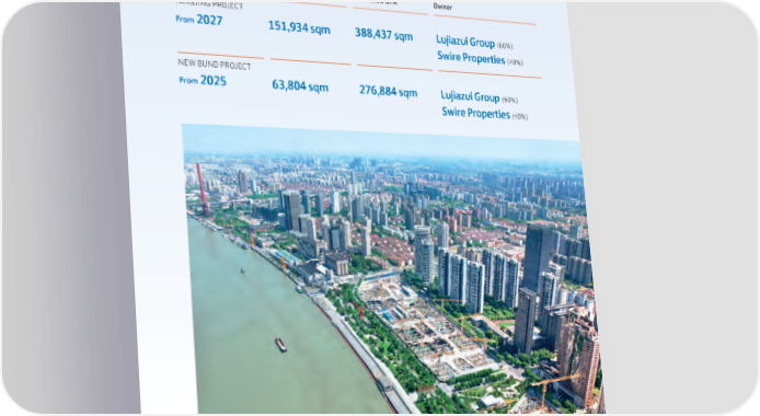 SWIRE PROPERTIES ANNUAL REPORT 2023 Estimated Completion Year Site Area Estimated GFA Owner YANGJING PROJECT From 2027 151,934 sqm 388,437 sqm Lujiazui Group (60%) Swire Properties (40%) NEW BUND PROJECT From 2025 63,804 sqm 276,884 sqm Lujiazui Group (60%) Swire Properties (40%) YANGJING PROJECT, SHANGHAI 65