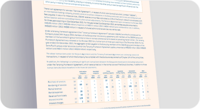 NOTES TO THE FINANCIAL STATEMENTS 40. Related Party Transactions Accounting Policy Related parties of the Group are individuals and companies, including subsidiary, fellow subsidiary, joint venture and associated companies and key management of the Group or the parent of the Group (including close members of their families), where the individual or company has the ability, directly or indirectly, to control the other party or exercise significant influence over the other party in making financial and operating decisions. There is an agreement for services (“Services Agreement”), in respect of which John Swire & Sons (H.K.) Limited (“JS&SHK”), an intermediate holding company, provides services to various companies in the Group and under which costs are reimbursed and fees payable. In return for these services, JS&SHK receives annual fees calculated as 2.5% of the Group’s relevant consolidated profit before taxation and non-controlling interests after certain adjustments. The Services Agreement were renewed on 1st October 2022 for three years expiring on 31st December 2025. For the year ended 31st December 2023, service fees payable amounted to HK$205 million (2022: HK$186 million). Expenses of HK$111 million (2022: HK$92 million) were reimbursed at cost; in addition, HK$103 million (2022: HK$80 million) in respect of shared administrative services was reimbursed. Under a tenancy framework agreement (the “Tenancy Framework Agreement”) between JS&SHK, Swire Pacific Limited and the Company dated 14th August 2014, members of the Group enter into tenancy agreements with members of the JS&SHK group and members of the Swire Pacific group from time to time on normal commercial terms based on prevailing market rentals. The Tenancy Framework Agreement was renewed on 1st October 2021 for a further term of three years expiring on 31st December 2024. For the year ended 31st December 2023, the aggregate rentals payable to the Group by members of the JS&SHK group and members of the Swire Pacific group under tenancies to which the Tenancy Framework Agreement applies amounted to HK$105 million (2022: HK$109 million) and HK$43 million (2022: HK$38 million) respectively. The above transactions under the Services Agreement and the Tenancy Framework Agreement are continuing connected transactions, in respect of which the Company has complied with the disclosure requirements of Chapter 14A of the Listing Rules. In addition, the following is a summary of significant transactions between the Group and related parties (including transactions under the Tenancy Framework Agreement), which were carried out in the normal course of the Group’s business, in addition to those transactions disclosed elsewhere in the financial statements. Joint venture Associated Fellow Immediate Intermediate Other companies companies subsidiary companies holding company holding company related parties 2023 2022 2023 2022 2023 2022 2023 2022 2023 2022 2023 2022 Note HK$M HK$M HK$M HK$M HK$M HK$M HK$M HK$M HK$M HK$M HK$M HK$M Purchase of services (a) – – – – 37 28 – – – – – – Rendering of services (a) 69 67 – – – – – – 1 8 – – Rental revenue (b) – – – – 43 28 – 10 105 109 1 1 Rental expenses (b) 10 9 – – – – – – – – – – Revenue from hotels 16 9 – – 3 – – – 2 1 4 70 Interest income (c) 129 50 7 – – – – – – – – – Interest charges (c) 2 16 – – – – – – – – – – Notes: (a) Purchase and rendering of services from and to related parties were conducted in the normal course of business at prices and on terms no less favourable to the Group than those charged by/to and contracted with other suppliers/customers of the Group. (b) The Group has, in the normal course of its business, entered into lease agreements with related parties to lease premises for varying periods up to six years. The leases were entered into on normal commercial terms. (c) Loans advanced to joint venture and associated companies at 31st December 2023 are disclosed in notes 20 and 21. Advances from joint venture and associated companies are disclosed in note 26. Remuneration of key management, which includes Executive and Non-Executive Directors and Executive Officers, is disclosed in note 9. 202