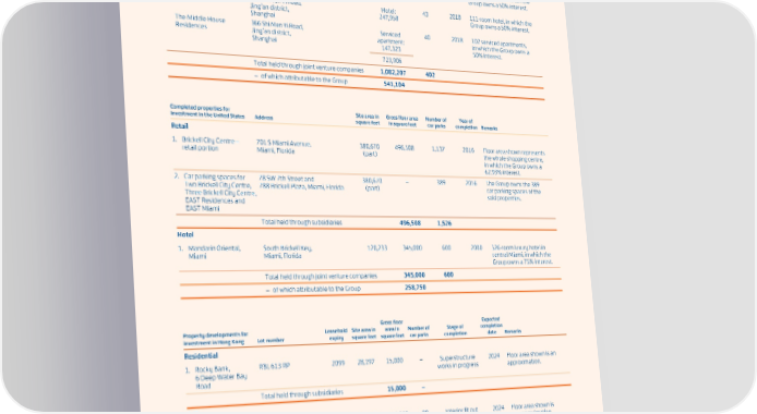 SCHEDULE OF PRINCIPAL GROUP PROPERTIES At 31st December 2023 Completed properties for Leasehold Site area in Gross floor area Number of Year of investment in the Chinese Mainland Address expiry square feet in square feet car parks completion Remarks Hotel (continued) 5. The Sukhothai Shanghai 380 Weihai Road, 2049 676,091 Hotel: 79 2018 201-room hotel, in which the Hotel Jing’an district, (part) 328,625 Group owns a 50% interest. Shanghai The Middle House 366 Shi Men Yi Road, Hotel: 43 2018 111-room hotel, in which the Jing’an district, 247,958 Group owns a 50% interest. Shanghai The Middle House 366 Shi Men Yi Road, Serviced 40 2018 102 serviced apartments, Residences Jing’an district, apartment: in which the Group owns a Shanghai 147,323 50% interest. 723,906 Total held through joint venture companies 1,082,207 402 – of which attributable to the Group 541,104 Completed properties for Site area in Gross floor area Number of Year of investment in the United States Address square feet in square feet car parks completion Remarks Retail 1. Brickell City Centre – 701 S Miami Avenue, 380,670 496,508 1,137 2016 Floor area shown represents retail portion Miami, Florida (part) the whole shopping centre, in which the Group owns a 62.93% interest. 2. Car parking spaces for 78 SW 7th Street and 380,670 – 389 2016 The Group owns the 389 Two Brickell City Centre, 788 Brickell Plaza, Miami, Florida (part) car parking spaces of the Three Brickell City Centre, sold properties. EAST Residences and EAST Miami Total held through subsidiaries 496,508 1,526 Hotel 1. Mandarin Oriental, South Brickell Key, 120,233 345,000 600 2000 326-room luxury hotel in Miami Miami, Florida central Miami, in which the Group owns a 75% interest. Total held through joint venture companies 345,000 600 – of which attributable to the Group 258,750 Gross floor Expected Property developments for Leasehold Site area in area in Number of Stage of completion investment in Hong Kong Lot number expiry square feet square feet car parks completion date Remarks Residential 1. Rocky Bank, RBL 613 RP 2099 28,197 15,000 – Superstructure 2024 Floor area shown is an 6 Deep Water Bay works in progress approximation. Road Total held through subsidiaries 15,000 – Office 1. Six Pacific Place, IL 2242 2843 14,433 223,303 88 Interior fit out 2024 Floor area shown is 46-56 Queen’s Road IL 2244 sA works in progress an approximation. East IL 2244 sB IL 2244 sC IL 2245 sA IL 2245 sB IL 2245 sC IL 2245 sD IL 2245 sE IL 2245 sF Total held through subsidiaries 223,303 88 218