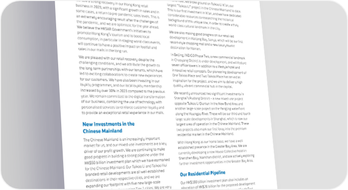 CHAIRMAN'S STATEMENT Recovery for Hong Kong Retail In November, we broke ground on Taikoo Li Xi’an, our We saw a strong recovery in our Hong Kong retail largest “Taikoo Li” project in the Chinese Mainland to date. business in 2023, with a significant growth in sales and in This is our first investment in Xi’an, and we have dedicated some cases, a return to pre-pandemic sales levels. This is considerable resources to researching the historical an extremely encouraging result after the challenges of background of this unique site, in order to create a truly the pandemic, and we are optimistic for the year ahead. world-class cultural landmark in the city. We believe the HKSAR Government’s initiatives to We are also making good progress on our retail-led promote Hong Kong’s tourism and to boost local development in Haitang Bay, Sanya, which will be our first consumption, in particular in staging world-class events, resort-style shopping mall and a new luxury tourist will continue to have a positive impact on footfall and destination for Hainan. sales in our malls in the long run. In Beijing, INDIGO Phase Two, a new commercial landmark We are pleased with our retail recovery despite the in Chaoyang District is under development, and will feature challenging conditions, and we attribute the growth to seven office towers in addition to a lifestyle hotel and the long-term partnerships with our tenants, which have innovative retail concepts. Our pioneering development of led to exciting collaborations to create new experiences One Taikoo Place and Two Taikoo Place has served as for our customers. We have also been investing in our inspiration for the project, and we aim to deliver a high loyalty programmes, and our local loyalty membership quality, vibrant commercial hub in the capital. increased by over 30% in 2023 compared to the previous We recently announced two significant investments in year. We remain committed to the digital transformation Shanghai’s Pudong District – a new mixed-use project of our business, combining the use of technology with opposite Taikoo Li Qiantan in the New Bund Area and personalised services to reinforce customer loyalty and another large-scale project on the Yangjing waterfront to provide an exceptional retail experience in our malls. along the Huangpu River. These will be our third and fourth New Investments in the large-scale developments in Shanghai, which is now our largest area of operation in the Chinese Mainland. These Chinese Mainland two projects also mark our first foray into the premium The Chinese Mainland is an increasingly important residential market in the Chinese Mainland. market for us, and our mixed-use investments are a key With Hong Kong as our home base, we have a well- driver of our profit growth. We are continuing to make established presence in the Greater Bay Area. We are good progress in building a strong pipeline under the currently developing a new House Collective hotel in HK$50 billion investment plan which we have earmarked Shenzhen Bay, Nanshan district, and are actively exploring for the Chinese Mainland. Our Taikoo Li and Taikoo Hui further investment opportunities in the Greater Bay Area. branded retail developments are all well-established Our Residential Pipeline destinations in their respective cities, and we are expanding our footprint with five new large-scale Our HK$100 billion investment plan also includes an projects in Tier-1 and emerging Tier-1 cities. We are very allocation of HK$20 billion for the proposed development pleased to have had the opportunity to complete the of our residential pipeline in Hong Kong and South East acquisition of the remaining interest in Taikoo Li Asia over the next decade. We have made significant Chengdu, one of our flagship malls in the Chinese progress over the past year, and have built up an exciting Mainland. 18