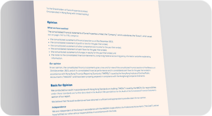 INDEPENDENT AUDITOR’S REPORT To the Shareholders of Swire Properties Limited (incorporated in Hong Kong with limited liability) Opinion What we have audited The consolidated financial statements of Swire Properties Limited (the “Company”) and its subsidiaries (the “Group”), which are set out on pages 142 to 210, comprise: • the consolidated statement of financial position as at 31st December 2023; • the consolidated statement of profit or loss for the year then ended; • the consolidated statement of other comprehensive income for the year then ended; • the consolidated statement of cash flows for the year then ended; • the consolidated statement of changes in equity for the year then ended; and • the notes to the consolidated financial statements, comprising material accounting policy information and other explanatory information. Our opinion In our opinion, the consolidated financial statements give a true and fair view of the consolidated financial position of the Group as at 31st December 2023, and of its consolidated financial performance and its consolidated cash flows for the year then ended in accordance with Hong Kong Financial Reporting Standards (“HKFRSs”) issued by the Hong Kong Institute of Certified Public Accountants (“HKICPA”) and have been properly prepared in compliance with the Hong Kong Companies Ordinance. Basis for Opinion We conducted our audit in accordance with Hong Kong Standards on Auditing (“HKSAs”) issued by the HKICPA. Our responsibilities under those standards are further described in the Auditor’s Responsibilities for the Audit of the Consolidated Financial Statements section of our report. We believe that the audit evidence we have obtained is sufficient and appropriate to provide a basis for our opinion. Independence We are independent of the Group in accordance with the HKICPA’s Code of Ethics for Professional Accountants (“the Code”), and we have fulfilled our other ethical responsibilities in accordance with the Code. Key Audit Matters Key audit matters are those matters that, in our professional judgement, were of most significance in our audit of the consolidated financial statements of the current period. These matters were addressed in the context of our audit of the consolidated financial statements as a whole, and in forming our opinion thereon, and we do not provide a separate opinion on these matters. PricewaterhouseCoopers, 22/F Prince’s Building, Central, Hong Kong SAR, China T: +852 2289 8888, F: +852 2810 9888, www.pwchk.com 138