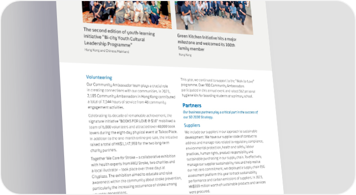 SWIRE PROPERTIES ANNUAL REPORT 2023 The second edition of youth-learning Green Kitchen Initiative hits a major initiative “Bi-city Youth Cultural milestone and welcomed its 100th Leadership Programme” family member Hong Kong and Chinese Mainland Hong Kong Volunteering This year, we continued to support to the “Walk for Love” Our Community Ambassador team plays a crucial role programme. Over 900 Community Ambassadors in creating connections with our communities. In 2023, participated in this annual event and raised 562 personal 2,185 Community Ambassadors in Hong Kong contributed hygiene kits for boarding students at a primary school. a total of 7,544 hours of service from 48 community Partners engagement activities. Celebrating its decade of remarkable achievement, the Our business partners play a critical part in the success of signature initiative “BOOKS FOR LOVE @ $10” mobilised a our SD 2030 Strategy. team of 6,000 volunteers and attracted over 40,000 book Suppliers lovers during the eight-day physical event at Taikoo Place. We include our suppliers in our approach to sustainable In addition to the one-month online pre-sale, the initiative development. We have our supplier code of conduct to raised a total of HK$1,147,950 for the two long-term address and manage risks related to regulatory compliance, charity partners. environmental protection, health and safety, labour Together We Care for Stroke – a collaborative exhibition practices, human rights, product responsibility and with health experts from HKU Stroke, two charities and sustainable purchasing in our supply chain. To effectively a local illustrator – took place over three days at manage our supplier sustainability risks and help realise Cityplaza. The exhibition aimed to educate and raise our net-zero commitment, we deployed a supply chain ESG awareness within the community about stroke prevention, assessment platform this year to track sustainability particularly the increasing occurrence of stroke among performance and carbon emissions of suppliers. In 2023, younger generations. HK$559 million worth of sustainable products and services In the Chinese Mainland, 1,403 Ambassadors contributed were procured. 3,140 hours of service. In May, the cross-city Community Tenants Ambassador team comprising members from Hong Kong We work closely with our commercial tenants to integrate and cities across the Chinese Mainland participated in the sustainability into their operations; and offer our office four-day programme “Helping the Youth, Harmony in and retail tenants in Hong Kong and the Chinese Mainland Diversity” in Chengdu, providing tailored volunteer services free energy audits to identify energy-saving opportunities. and workshops to university students from the Yi ethnic As at 31 December 2023, these audits covered group, individuals recovering from mental illnesses, rural approximately 7 million square feet of tenanted area. children and students from a non-profit vocational school. 131