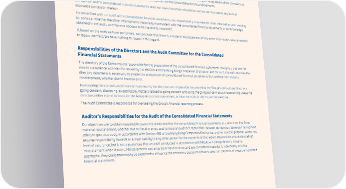 INDEPENDENT AUDITOR’S REPORT Other Information The directors of the Company are responsible for the other information. The other information comprises all of the information included in the annual report other than the consolidated financial statements and our auditor’s report thereon. The other information does not include the specific information presented therein that is identified as being an integral part of the consolidated financial statements and, therefore, covered by our audit opinion on the consolidated financial statements. Our opinion on the consolidated financial statements does not cover the other information and we do not express any form of assurance conclusion thereon. In connection with our audit of the consolidated financial statements, our responsibility is to read the other information and, in doing so, consider whether the other information is materially inconsistent with the consolidated financial statements or our knowledge obtained in the audit, or otherwise appears to be materially misstated. If, based on the work we have performed, we conclude that there is a material misstatement of this other information, we are required to report that fact. We have nothing to report in this regard. Responsibilities of the Directors and the Audit Committee for the Consolidated Financial Statements The directors of the Company are responsible for the preparation of the consolidated financial statements that give a true and fair view in accordance with HKFRSs issued by the HKICPA and the Hong Kong Companies Ordinance, and for such internal control as the directors determine is necessary to enable the preparation of consolidated financial statements that are free from material misstatement, whether due to fraud or error. In preparing the consolidated financial statements, the directors are responsible for assessing the Group’s ability to continue as a going concern, disclosing, as applicable, matters related to going concern and using the going concern basis of accounting unless the directors either intend to liquidate the Group or to cease operations, or have no realistic alternative but to do so. The Audit Committee is responsible for overseeing the Group’s financial reporting process. Auditor’s Responsibilities for the Audit of the Consolidated Financial Statements Our objectives are to obtain reasonable assurance about whether the consolidated financial statements as a whole are free from material misstatement, whether due to fraud or error, and to issue an auditor’s report that includes our opinion. We report our opinion solely to you, as a body, in accordance with Section 405 of the Hong Kong Companies Ordinance, and for no other purpose. We do not assume responsibility towards or accept liability to any other person for the contents of this report. Reasonable assurance is a high level of assurance, but is not a guarantee that an audit conducted in accordance with HKSAs will always detect a material misstatement when it exists. Misstatements can arise from fraud or error and are considered material if, individually or in the aggregate, they could reasonably be expected to influence the economic decisions of users taken on the basis of these consolidated financial statements. 140