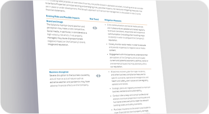 CORPORATE GOVERNANCE & SUSTAINABILITY RISK MANAGEMENT Risk Profile The following table provides an overview of our key risk profile (listed in alphabetical order), including what we consider to be Swire Properties’ principal existing and emerging risks, possible impacts, risk trend and mitigating measures that are in place or under development. The Group’s approach to financial risk management is discussed in note 2 to the financial statements. Existing Risks and Possible Impacts Risk Trend Mitigation Measures Brand and image • Crisis communication and social media policies The failure to maintain brand position and are in place and are updated and tested regularly perception may make us less competitive. to ensure consistent, responsible and responsive Social media, in particular, is considered as a communication (including when handling major high velocity risk which, if not properly incidents) in order to safeguard the Company’s managed, may cause disproportionate reputation. negative impact on the Company’s brand, • Closely monitor social media in order to evaluate image and reputation. and provide responses to negative social media content. • Engagement with third parties to understand their perceptions of the Company and to anticipate current and potential economic, political, social or environmental issues that may adversely affect our reputation. Business disruption • A business recovery plan for major incidents, Severe disruption to the business caused by and other business compliance measures for acts of man or acts of nature such as specific scenarios, operational emergencies and extreme weather and pandemics may have health and safety, are in place and are regularly adverse financial effects on the Company. updated and tested. • Strategic plans are regularly reviewed to maintain business resilience and sustainability. • Conduct site surveys and consult professional advisors to ensure properties in earthquake and hurricane zones are built to meet the relevant building codes and safety standards. • Purchase insurance to the extent practicable to cover financial loss due to property damage, business interruption and third-party liabilities. Risk level increased during the year 2023 Risk level decreased during the year 2023 Risk level remained broadly the same 114