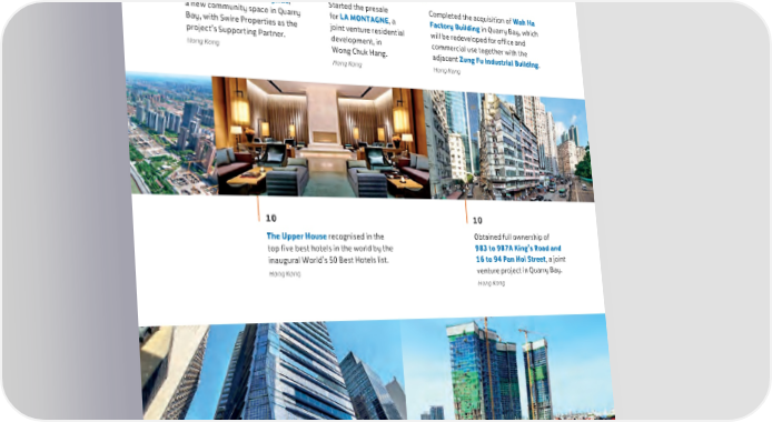 SWIRE PROPERTIES ANNUAL REPORT 2023 06 07 07 Officially launched Quarryside, Started the presale Completed the acquisition of Wah Ha a new community space in Quarry for LA MONTAGNE, a Factory Building in Quarry Bay, which Bay, with Swire Properties as the joint venture residential will be redeveloped for office and project’s Supporting Partner. development, in commercial use together with the Hong Kong Wong Chuk Hang. adjacent Zung Fu Industrial Building. Hong Kong Hong Kong 10 10 The Upper House recognised in the Obtained full ownership of top five best hotels in the world by the 983 to 987A King’s Road and inaugural World’s 50 Best Hotels list. 16 to 94 Pan Hoi Street, a joint Hong Kong venture project in Quarry Bay. Hong Kong 02 2024 02 2024 Completed Six Pacific Place office tower, Savyavasa, a luxury residential property which marks a key milestone to the expansion in Indonesia, officially topped out. of the greater Pacific Place portfolio. Jakarta Hong Kong 7