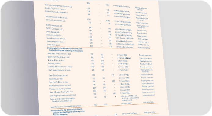 SWIRE PROPERTIES ANNUAL REPORT 2023 Owned Attributable Owned by to the Group directly subsidiaries Issued and fully paid up % % % shares/Registered capital Principal activities Subsidiary companies (continued): Incorporated in the United States with limited liability and operating in the United States: 50A Developer LLC 100 – 100 Limited Liability Company Property trading and investment BCC Hotel Management Services LLC 100 – 100 Limited Liability Company Hotel management Brickell City Centre Plaza LLC 100 – 100 Limited Liability Company Property investment Brickell City Centre Project LLC 100 – 100 Limited Liability Company Property trading and investment Brickell City Centre Retail LLC 62.93 – 87.93 Limited Liability Company Property investment OID Holding Company LLC 100 – 100 Limited Liability Company Property trading and investment OID T1 Developer LLC 100 – 100 Limited Liability Company Property trading OID T2 Developer LLC 100 – 100 Limited Liability Company Property trading Swire Jadeco LLC 100 – 100 Limited Liability Company Property trading Swire Properties Inc 100 – 100 1,000 shares of US$0.01 each Holding company Swire Properties One LLC 100 – 100 Limited Liability Company Holding company Swire Properties US Inc 100 – 100 1,000 shares of US$0.01 each Holding company Swire Realty LLC 100 – 100 Limited Liability Company Real estate agency Incorporated in the British Virgin Islands with limited liability and operating in Hong Kong: Apex Best Investments Limited 100 100 – 1 share of US$1 Property investment Boom View Holdings Limited 100 100 – 2 shares of US$1 each Property investment Cherish Shine Limited 100 100 – 1 share of US$1 Property investment Da Long Limited 100 100 – 1 share of US$1 Property investment Gold Fountain Ventures Limited 100 100 – 1 share of US$1 Property investment High Grade Ventures Limited 100 100 – 1 share of US$1 Property trading and investment Keen Elite Group Limited 100 – 100 1 share of US$1 Property investment Novel Ray Limited 100 100 – 1 share of US$1 Property investment One Pacific Place Limited 100 – 100 1 share of US$1 Property investment Park Concept Group Limited 100 100 – 1 share of US$1 Property investment Prosperous Dynasty Limited 100 100 – 1 share of US$1 Property investment Sound Dragon Trading Co., Ltd. 100 100 – 1 share of US$1 Property investment Sino Flagship Investments Limited 100 – 100 1 share of US$1 Property investment Swire and Island Communication 60 60 – 100 shares of HK$10 each Property investment Developments Limited (d) and 1 non–voting dividend share of HK$10 Swire Properties China Holdings Limited 100 100 – 1 share of US$1 Holding company Incorporated in the British Virgin Islands with limited liability and operating in the Chinese Mainland: Great City China Holdings Limited 100 – 100 100 shares of US$1 each Holding company Joint venture companies: Incorporated in Hong Kong with limited liability and operating in Hong Kong: Hareton Limited (d) 50 – 50 100 shares (HK$1,000) Property investment Pacific Grace Limited 50 – (c) 2 shares (HK$2) Property investment Richly Leader Limited 50 – 50 1,000,000,000 shares Property investment (HK$700,000,000) Incorporated in the United States with limited liability and operating in the United States: Swire Brickell Key Hotel, Ltd. 75 – 75 Florida Partnership Hotel investment 209