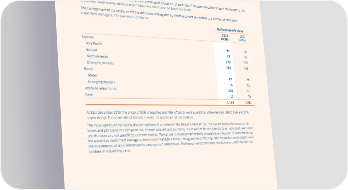 SWIRE PROPERTIES ANNUAL REPORT 2023 32. Retirement Benefits (continued) (e) The plan assets are invested in the Swire Group Unitised Trust (“the Unitised Trust”). The Unitised Trust has four sub-funds in which the assets may be invested in accordance with separate and distinct investment policies and objectives. The Unitised Trust and sub-funds are overseen by an investment committee, which meets four times a year. The make-up of the Unitised Trust is the result of the asset allocation of each plan. The asset allocation of each plan targets a mix of equities, fixed income, absolute return funds and short duration bond sub-funds. The management of the assets within the sub-funds is delegated by the investment committee to a number of reputable investment managers. The plan assets comprise: Defined benefit plans 2023 2022 HK$M HK$M Equities Asia Pacific 95 76 Europe 78 67 North America 270 228 Emerging markets 286 248 Bonds Global 97 86 Emerging markets 16 11 Absolute return funds 300 283 Cash 13 33 1,155 1,032 At 31st December 2023, the prices of 89% of equities and 70% of bonds were quoted on active markets (2022: 96% and 29% respectively). The remainder of the prices were not quoted on active markets. The most significant risk facing the defined benefit schemes of the Group is market risk. This risk embodies the potential for losses and gains and includes price risk, interest rate risk and currency risk as well as factors specific to an individual investment and its issuer and risk specific to a certain market. Market risk is managed principally through diversification of investments by the appointed investment managers. Investment managers enter into agreements that stipulate the performance objective of the investments, which is referenced to a recognised benchmark. The investment committee monitors the overall market risk position on a quarterly basis. 193