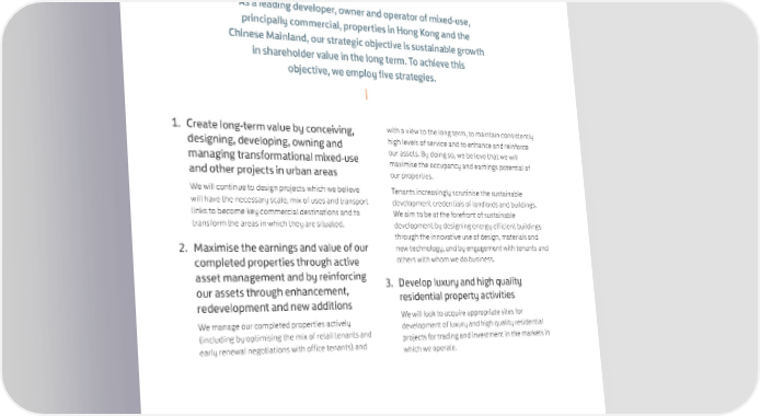 KEY BUSINESS STRATEGIES As a leading developer, owner and operator of mixed-use, principally commercial, properties in Hong Kong and the Chinese Mainland, our strategic objective is sustainable growth in shareholder value in the long term. To achieve this objective, we employ five strategies. 1. Create long-term value by conceiving, with a view to the long term, to maintain consistently designing, developing, owning and high levels of service and to enhance and reinforce managing transformational mixed-use our assets. By doing so, we believe that we will and other projects in urban areas maximise the occupancy and earnings potential of our properties. We will continue to design projects which we believe Tenants increasingly scrutinise the sustainable will have the necessary scale, mix of uses and transport development credentials of landlords and buildings. links to become key commercial destinations and to We aim to be at the forefront of sustainable transform the areas in which they are situated. development by designing energy efficient buildings through the innovative use of design, materials and 2. Maximise the earnings and value of our new technology, and by engagement with tenants and completed properties through active others with whom we do business. asset management and by reinforcing 3. Develop luxury and high quality our assets through enhancement, residential property activities redevelopment and new additions We manage our completed properties actively We will look to acquire appropriate sites for (including by optimising the mix of retail tenants and development of luxury and high quality residential early renewal negotiations with office tenants) and projects for trading and investment in the markets in which we operate. 24