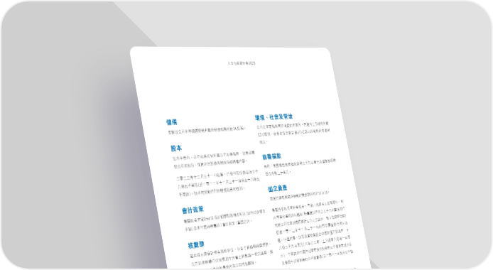 ˄̚ήପజѓࣣ2023 儲備 環境、社會及管治 ණྠʿʮ̡͉ϋᎷ௪ᜊਗ̊༱ৌਕజڌڝൗ34ʿ35f ʮ̡ίϋܓజѓࣣהႊٙϋܓʫdʊ፭ςɪ̹ۆڝ C2 ᐑྤeٟึʿ၍طజѓܸˏ‘ Cʱה༱ٙהϞቇ͜ ૢ˖f 股本 ί͉ϋܓʫdʮ̡אՉОڝ᙮ʮ̡ԨೌᒅΫëਯאᛙ 慈善捐款 Ϋʮٰ̡ٙ΅dණྠ͵ೌમॶОٰ΅Ⴉᒅᛆࠇྌf ϋʫdණྠᅡ̈ฉഛ࣏ಛಥ࿆ɧɷɘϵຬʩʿ࣏ᗍධᆤ ɚཧɚɧϋɤɚ˜ɧɤɓ˚ഐၑdʊ೯Бٰ΅ᅰͦމʞɤ ኪږಥ࿆ɧɤຬʩf ɞᄂʞɷຬٰ€ɚཧɚɚϋɤɚ˜ɧɤɓ˚މʞɤɞᄂʞ 33f ɷຬٰfٰ͉ٙᜊਗ༉ΐৌਕజڌڝൗ 固定資產 ո֛༟ପٙᜊਗ༉ઋ༱ৌਕజڌڝൗ15ʿ16f 會計政策 ණྠٙࠠɽึࠇ݁ഄ༱ᗫৌਕజڌڝൗ€νၾत֛ධͦ ණྠܵϞٙҳ༟يุଡ଼Υdʔሞʊໝϓא͍ί೯࢝ʕdѩ Ϟᗫʿ͉ϋܓజѓࣣٙ˜ึࠇ݁ഄ™ືʘʫf ͟ਖ਼ุΥ༟ࣸٙП࠽ࢪ€ܲᄆ࠽ࠇϵʱʘɘɤʬ͟ᏖᅃБ Ϟࠢʮ̡П࠽ʿܲᄆ࠽ࠇϵʱʘɚ̤͟ɓዹͭП࠽ࢪП࠽ ࣬ኽɚཧɚɧϋɤɚ˜ɧɤɓ˚̹ٙఙᄆ࠽ආБմϋП 核數師 ࠽fП࠽ഐ؈d༈ഃҳ༟يุଡ଼Υٙሪࠦ࠽ɨൻಥ࿆ɚɤ ᖯжە͑༸ึࠇࢪԫਕהৗdԨΥ˷༟ࣸᗴࡉ፯ᚃ໌f ɞᄂɚɷɘϵຬʩ€ɚཧɚɚϋjɪʺಥ࿆ɞᄂཧɓϵຬ ʮ̡уਗ਼ᑘБٰٙ؇մϋɽึɪਗ਼ਗᙄɓධӔᙄࣩdᚃ ʩd˴ࠅ͟ʕʫήཧਯҳ༟يุٙʮ̻࠽ϗूಯˇ˸ ໌ᖯжە͑༸ึࠇࢪԫਕהމʮ̡ٙࣨᅰࢪf ʿ೯࢝ʕҳ༟يุٙʮ̻࠽ᑦฦ€Ͼɚཧɚɚϋۆމʮ̻࠽ ϗूf 財務評述 ණྠʿՉΥ༟ʮ̡ၾᑌ᙮ʮ̡הኹϞٙ˴ࠅيุ༱͉ϋ ණྠၝΥุᐶeৌਕًرʿତږݴඎٙ൙ࠑ༱͉ϋܓజ ܓజѓࣣٙ˜ණྠ˴ࠅيุ™ືʘʫf ѓࣣٙ˜ৌਕ൙ࠑ™ືʘʫfණྠุᐶʿ༟ପၾࠋවٙ ɤϋৌਕ฿ࠅ༱͉ϋܓజѓࣣٙ˜ɤϋৌਕ฿ࠅ™ື ʘʫf 借貸 ණྠٙ࠾൲༉ઋ༱͉ϋܓజѓࣣٙ˜ፄ༟™ືʘʫf 企業管治 ʮ̡ίϋܓజѓࣣהႊٙࡈϋܓʫѩϞ፭ςɪ̹ۆ 利息 C1ୋɚʱה༱Άุ၍طςۆ€˜Άุ၍طςۆ™ٙה ڝ ණྠ༟͉ʷٙлࢹᅰᕘΐୋ86ࠫf Ϟςۆૢ˖f 主要顧客及供應商 ʮ̡ٙΆุ၍ط੬༉༱͉ϋܓజѓࣣٙ˜Άุ၍ط™ ϋʫdණྠʞɽᚥ܄ʿԶᏐਠʱйЦණྠٙቖਯᕘʔԑɧ ືʘʫf ϓʿમᒅᕘʔԑɧϓf 121