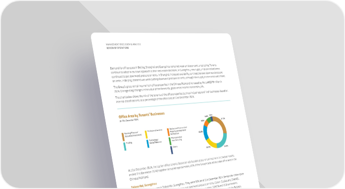 27.7% 15.8% 6.8% 23.8% 16.5% 6.6% 2.8% Banking/Finance/ Securities/Investment Trading Professional services Technology/ Media/Telecoms Real estate/Construction/ Property development/ Architecture Pharmaceutical manufacturing Others Office Area by Tenants’ Businesses (At 31st December 2024) 50 MANAGEMENT DISCUSSION & ANALYSIS REVIEW OF OPERATIONS At 31st December 2024, the top ten office tenants (based on attributable gross rental income in the twelve months ended 31st December 2024) together occupied approximately 45% of the Group’s total attributable office area in the Chinese Mainland. Taikoo Hui, Guangzhou There are two office towers in Taikoo Hui, Guangzhou. They were 90% let at 31st December 2024. Demand for office space in 2024 was weak. New supply in decentralised areas put downward pressure on rents. Canon, CapitaLand, CHANEL, Everwin Law, FedEx, HSBC, Microsoft, Roche, Samsung, SK, Sumitomo Corporation, TOYOTA and UOB are tenants. Eyugame, SGLA Law Firm and Donoo leased more space in 2024. Hair Code, Harmony Excellence and Vialto Partners became tenants in 2024. INDIGO, Beijing ONE INDIGO, part of Taikoo Place Beijing, was 83% let at 31st December 2024. Demand for office space in 2024 was weak. Increased office vacancy rates, particularly in Wangjing area of the Chaoyang district exerted downward pressure on rents. The main tenants are technology, media and telecoms companies. Alcon, CJ Group, Disney, Eli Lilly, Mitsubishi, Rolls Royce, Schlumberger and Western Cloud are tenants. Bell Cloud Technology and Cathay Pacific became tenants in 2024. Demand for office space in Beijing, Shanghai and Guangzhou remained weak amid economic uncertainty. Tenants continue to adopt a cautious approach to their real estate decisions. In Guangzhou, new supply in decentralised areas continued to put downward pressure on rents. In Shanghai, increased availability continued to exert downward pressure on rents. In Beijing, demand was weak putting downward pressure on rents, although new supply in core areas was limited. The Group’s gross rental income from office properties in the Chinese Mainland increased by 4% to HK$379 million in 2024. Disregarding changes in the value of the Renminbi, gross rental income increased by 6%. The chart below shows the mix of the tenants of the office properties by the principal nature of their businesses (based on internal classifications) as a percentage of the office area at 31st December 2024.