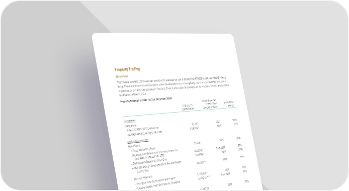 57 SWIRE PROPERTIES ANNUAL REPORT 2024 Property Trading Overview The trading portfolio comprises completed units available for sale at EIGHT STAR STREET and LA MONTAGNE in Hong Kong. There are nine residential projects under development, four in Hong Kong, two in the Chinese Mainland, one in Indonesia, one in Vietnam and one in Thailand. There is also a plan to develop a luxury residential project on part of our land banks in Miami, U.S.A. Property Trading Portfolio (At 31st December 2024) GFA (sq. ft.) (100% Basis) Actual/Expected Construction Completion Date Attributable Interest Completed Hong Kong – EIGHT STAR STREET, Wan Chai 2,178(1) 2022 100% – LA MONTAGNE, Wong Chuk Hang 519,366(1) 2024 25% Under Development Hong Kong – 6 Deep Water Bay Road 15,000 2025 100% – The Headland Residences (formerly known as Chai Wan Inland Lot No. 178) 692,276(2) from 2025 80% – 269 Queen’s Road East, Wan Chai 102,990(3) 2026 100% – 983-987A King’s Road and 16-94 Pan Hoi Street, Quarry Bay 440,000(4) 2028 50% Chinese Mainland – Shanghai New Bund Mixed-use Project 1,159,057(5) 2026 40% – Lujiazui Taikoo Yuan Residences, Shanghai 1,222,751(4)(6) from 2026 40% Indonesia – Savyavasa, South Jakarta 1,122,728 2025 50% Vietnam – Empire City, Ho Chi Minh City 5,357,318 2030 15.73% Thailand – Wireless Road Project, Bangkok 1,632,067(4) 2029 40% Held for Development or sale U.S.A. – South Brickell Key, Miami, Florida 550,000 under planning 100% – Brickell City Centre, Miami, Florida – North Squared site 523,000(7) N/A 100% (1) Remaining saleable area. (2) Excluding a retail shop of approximately 2,002 sq. ft. (3) Excluding a retail podium of approximately 13,197 sq. ft. (4) Total GFA subject to change. (5) Residential GFA only. (6) Excluding the public rental housing of approximately 71,925 sq. ft. to be handed over to the Government upon completion. (7) Represents saleable area.