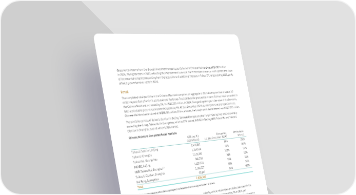 45 SWIRE PROPERTIES ANNUAL REPORT 2024 Gross rental income from the Group’s investment property portfolio in the Chinese Mainland was HK$4,907 million in 2024, 7% higher than in 2023, reflecting the improvement to tenant mix in the cities where our malls operate and share of incremental rental income arising from the acquisitions of additional interests in Taikoo Li Chengdu during 2023, partly offset by lower turnover rents in 2024. Retail The completed retail portfolio in the Chinese Mainland comprises an aggregate of 7.8 million square feet of space, 6.2 million square feet of which is attributable to the Group. Total attributable gross rental income from our retail properties in the Chinese Mainland increased by 2%, to HK$5,225 million, in 2024. Disregarding changes in the value of the Renminbi, total attributable gross rental income increased by 4%. At 31st December 2024, our completed retail properties in the Chinese Mainland were valued at HK$68,966 million. Of this amount, the Group’s attributable interest was HK$57,953 million. The portfolio consists of Taikoo Li Sanlitun in Beijing, Taikoo Li Chengdu and Hui Fang in Guangzhou, which are wholly- owned by the Group, Taikoo Hui in Guangzhou, which is 97% owned, INDIGO in Beijing, HKRI Taikoo Hui and Taikoo Li Qiantan in Shanghai, each of which is 50% owned. Chinese Mainland Completed Retail Portfolio GFA (sq. ft.) (100% Basis) Occupancy (at 31st December 2024) Attributable Interest Taikoo Li Sanlitun, Beijing 1,618,801 98% 100% Taikoo Li Chengdu 1,354,624 96% 100% Taikoo Hui, Guangzhou 1,529,392 100% 97% INDIGO, Beijing 946,769 98% 50% HKRI Taikoo Hui, Shanghai (1) 1,107,220 93% 50% Taikoo Li Qiantan, Shanghai 1,188,727 98% 50% Hui Fang, Guangzhou 90,847 78% 100% Total 7,836,380 (1) Including spaces allocated to prospective tenants who have signed letters of intent. In the Chinese Mainland, record-high retail sales were achieved in 2023, following the lifting of pandemic-related restrictions. However, retail sales in the Chinese Mainland dropped in 2024 due to an increase in outbound travel, depreciation in certain foreign currencies and disruption caused by upgrading works in some malls. Despite this, overall foot traffic continued to increase, underscoring the appeal of our malls as the preferred destinations for visitors. Retail sales started to stabilise in the last quarter of 2024 reflecting improved consumer confidence following the announcement by the government of economic stimulus measures at the end of September 2024. Structural and reconfiguration works in Taikoo Li Sanlitun North in Beijing and HKRI Taikoo Hui in Shanghai for tenant mix enhancement are in progress. Our retail sales (excluding sales by vehicle retailers) on an attributable basis in the Chinese Mainland decreased by 7% in 2024, yet outperforming the market, and 55% higher than the same period in 2019 (pre-pandemic). Retail sales in Taikoo Li Sanlitun in Beijing decreased slightly by less than 1%, and Taikoo Li Chengdu, Taikoo Hui in Guangzhou, INDIGO in Beijing and HKRI Taikoo Hui in Shanghai decreased by 14%, 11%, 4% and 14%, respectively, while Taikoo Li Qiantan in Shanghai increased by 3% in 2024. By comparing 2024 with that of 2019, retail sales at Taikoo Li Sanlitun, Taikoo Li Chengdu and Taikoo Hui increased by 1%, 24% and 67%, respectively, whereas INDIGO decreased by 1% and HKRI Taikoo Hui was a decrease of 15% due to the disruption caused by the major structural and reconfiguration works, while Taikoo Li Qiantan had not yet commenced business in 2019.