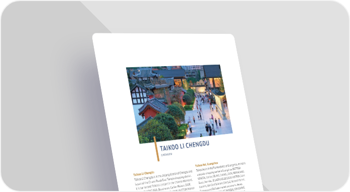 47 SWIRE PROPERTIES ANNUAL REPORT 2024 Taikoo Hui, Guangzhou Taikoo Hui is in the Tianhe district of Guangzhou. Its mall is a popular shopping centre in Guangzhou. BOTTEGA VENETA, Cartier, CELINE, CHANEL, DIOR, FERRAGAMO, Gucci, Hermès, I.T, LAOPU GOLD, LOUIS VUITTON, Saint Laurent, Van Cleef & Arpels, UNIQLO, Victoria’s Secret, Fangsuo and Olé Supermarket are tenants. Aesop, American Vintage, BREGUET, BYREDO, CONSOMMÉ, CREED, CURIEL, Dim bar, Diptyque, glance, HEFANG Jewelry, IRO, L’Artisan Parfumeur, LADERACH, LE LABO, LOEWE, MOODY TIGER, MIKIMOTO, NARS, Penhaligon’s, RUXU, SALOMON, The North Face, UNDERBOBO, and Vivienne Westwood became tenants in 2024. Retail sales and gross rental income at Taikoo Hui decreased by 11% and 6%, respectively, in 2024, reflecting the increased outbound travel. There were improvements in the tenant mix. The mall was 100% let at 31st December 2024. In August 2024, Taikoo Hui successfully bid for No. 387 Tianhe Road in a public auction, with an approximate GFA of 655,000 square feet, which is connected to its shopping mall. The property will be renovated as a luxury retail addition to Taikoo Hui and the refurbishment is expected to be completed from 2027. Taikoo Li Chengdu Taikoo Li Chengdu is in the Jinjiang district of Chengdu and is part of the Chunxi Road/Daci Temple shopping district. It is our second Taikoo Li project in the Chinese Mainland. Apple, BALENCIAGA, Boucheron, Cartier Maison, DIOR, Gucci, Harry Winston, Hermès, I.T, LOUIS VUITTON Maison and The Hall by LOUIS VUITTON, Moncler, MUJI, World of Ralph Lauren, Fangsuo, Olé Supermarket and a 1,720-seat Palace-j’aime cinema are tenants. In 2024, over 60 brands opened new stores or upgraded to their latest concept stores including Aesop, Abercrombie & Fitch, Birkenstock, DIOR, Falconeri, Goldwin, Goyard, Huawei, Lemaire, LE LABO, LOEWE flagship store, Montblanc flagship store, RIMOWA, Tiffany & Co. flagship store, and Song Restaurant and Café. Disregarding the impact arising from the incremental shareholding acquired at Taikoo Li Chengdu in February 2023, retail sales decreased by 14% in 2024 while gross rental income was on par with 2023, reflecting disruption caused by the reconfiguration works to facilitate tenant mix upgrade. The Group continues to reinforce the development as a premium shopping and leisure destination. The development was 96% let at 31st December 2024. TAIKOO LI CHENGDU C H E N G D U