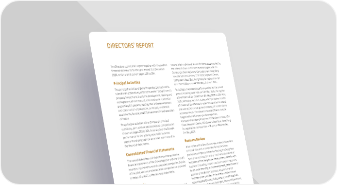 119 SWIRE PROPERTIES ANNUAL REPORT 2024 The Directors submit their report together with the audited financial statements for the year ended 31st December 2024, which are set out on pages 138 to 204. Principal Activities The principal activities of Swire Properties Limited and its subsidiaries (collectively referred to as the “Group”) are: (i) property investment, that is the development, leasing and management of commercial, retail and some residential properties; (ii) property trading, that is the development and construction of properties, principally residential apartments, for sale; and (iii) investment in and operation of hotels. The principal activities of the Company’s principal subsidiary, joint venture and associated companies are shown on pages 202 to 204. An analysis of the Group’s performance for the year by reportable business segment and geographical area is set out in note 8 to the financial statements. Consolidated Financial Statements The consolidated financial statements incorporate the financial statements of the Group together with the Group’s interests in joint venture and associated companies. Details of the joint venture and associated companies are provided in notes 20 and 21 to the financial statements. Dividends The Directors have declared a second interim dividend of HK$0.76 per share which, together with the first interim dividend of HK$0.34 per share paid in October 2024, amount to full year dividend of HK$1.10 (2023: HK$1.05) per share. The second interim dividend will be paid on Thursday, 8th May 2025 to shareholders registered at the close of business on the record date, being Thursday, 3rd April 2025. Shares of the Company will be traded ex-dividend as from Tuesday, 1st April 2025. The Company’s dividend policy is to deliver sustainable growth in dividends and to pay out approximately half of our underlying profit in ordinary dividends over time. Closure of Register of Members The register of members will be closed on Thursday, 3rd April 2025, during which day no transfer of shares will be effected. In order to qualify for entitlement to the second interim dividend, all transfer forms accompanied by the relevant share certificates must be lodged with the Company’s share registrars, Computershare Hong Kong Investor Services Limited, 17th Floor, Hopewell Centre, 183 Queen’s Road East, Hong Kong, for registration not later than 4:30 p.m. on Wednesday, 2nd April 2025. To facilitate the processing of proxy voting for the annual general meeting to be held on 13th May 2025, the register of members will be closed from 8th May 2025 to 13th May 2025, both days inclusive, during which period no transfer of shares will be effected. In order to be entitled to attend and vote at the annual general meeting, all transfer forms accompanied by the relevant share certificates must be lodged with the Company’s share registrars, Computershare Hong Kong Investor Services Limited, 17th Floor, Hopewell Centre, 183 Queen’s Road East, Hong Kong, for registration not later than 4:30 p.m. on Wednesday, 7th May 2025. Business Review A fair review of the Group’s business, a description of the principal risks and uncertainties facing the Group, particulars of important events affecting the Group that have occurred since the end of the financial year and an indication of the likely future development of the Group’s business (including, in each case to the extent necessary for an understanding of the development, performance or position of the Group’s business, key performance indicators) are provided in the sections of this annual report headed Chairman’s Statement, Chief Executive’s Statement, Key Business Strategies, Review of Operations, Financial Review and Financing and in the notes to the financial statements. To the extent necessary for an understanding of the development, performance or position of the Group’s business, a discussion of the Group’s environmental policies and performance and an account of the Group’s key relationships with its employees, customers and suppliers and others that have a significant impact on the Group and on which the Group’s success depends are provided in the section of this annual report headed Sustainability Review, and a discussion of the Group’s compliance with the relevant laws and regulations that have a significant impact on the Group is provided in the sections of this annual report headed Sustainability Review, Corporate Governance, Risk Management and Directors’ Report. Detailed information on the Group’s sustainability performance is provided in the Sustainability Report 2024 of the Company. DIRECTORS’ REPORT