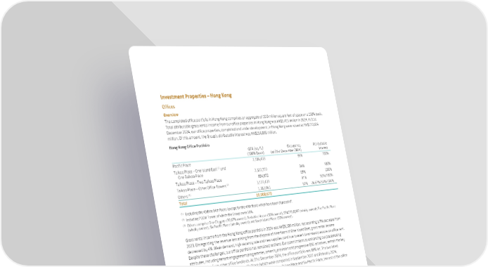 27.2% 15.4% 8.5% 7.2% 20.6% 10.0% 0.6% 10.5% Banking/Finance/ Securities/Investment Trading Professional services (Accounting/Legal/ Management consulting/ Corporate secretarial) Insurance Technology/ Media/Telecoms Real estate/Construction/ Property development/ Architecture Advertising and public relations Others Office Area by Tenants’ Businesses (At 31st December 2024) 37 SWIRE PROPERTIES ANNUAL REPORT 2024 Investment Properties – Hong Kong Offices Overview The completed office portfolio in Hong Kong comprises an aggregate of 10.0 million square feet of space on a 100% basis. Total attributable gross rental income from our office properties in Hong Kong was HK$5,415 million in 2024. At 31st December 2024, our office properties, completed and under development, in Hong Kong were valued at HK$173,684 million. Of this amount, the Group’s attributable interest was HK$164,895 million. Hong Kong Office Portfolio GFA (sq. ft.) (100% Basis) Occupancy (at 31st December 2024) Attributable Interest Pacific Place 2,186,433 95% 100% Taikoo Place – One Island East (1) and One Taikoo Place 2,322,772 94% 100% Taikoo Place – Two Taikoo Place 994,973 69% 100% Taikoo Place – Other Office Towers (2) 3,122,431 91% 50%/100% Others (3) 1,382,061 82% 26.67%/50%/100% Total 10,008,670 (1) Excluding the 45th to 54th floors (except for the 49th floor) which have been disposed of. (2) Including PCCW Tower, of which the Group owns 50%. (3) Others comprise One Citygate (26.67% owned), Berkshire House (50% owned), SPACES.8QRE (wholly-owned), Five Pacific Place (wholly-owned), Six Pacific Place (wholly-owned) and South Island Place (50% owned). Gross rental income from the Hong Kong office portfolio in 2024 was HK$5,109 million, representing a 7% decrease from 2023. Disregarding the revenue loss arising from the disposal of nine floors of One Island East, gross rental income decreased by 4%. Weak demand, high vacancy rate and new supplies continue to exert downward pressure on office rent. Despite these challenges, our office portfolio has remained resilient. Our commitments to enhancing our placemaking attributes, including tenant engagement programmes, amenity provision and progressive ESG initiatives, remain the key differentiation from other office landlords. At 31st December 2024, the office portfolio was 89% let. The two latest buildings, Two Taikoo Place and Six Pacific Place (which were completed in September 2022 and February 2024, respectively), were 69% and 53% let, respectively. Excluding Two Taikoo Place and Six Pacific Place, the rest of the office portfolio was 93% let. The chart below shows the mix of tenants of the office properties by the principal nature of their businesses (based on internal classifications) as a percentage of the office area at 31st December 2024.