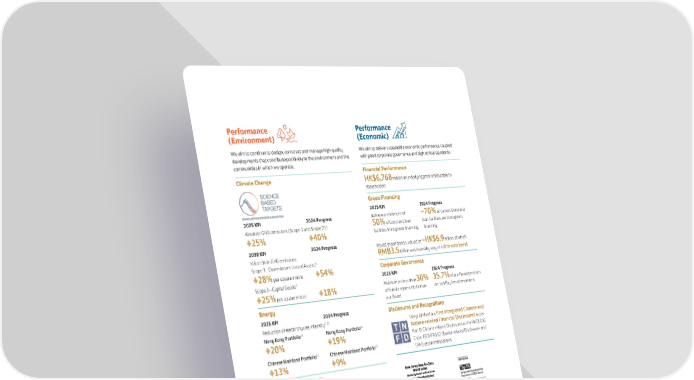 11 SWIRE PROPERTIES ANNUAL REPORT 2024 We aim to continue to design, construct and manage high quality developments that contribute positively to the environment and the communities in which we operate. Climate Change 2025 KPI 2024 Progress Absolute GHG emissions (Scope 1 and Scope 2)7: 25% 40% 2030 KPI 2024 Progress Value chain GHG emissions Scope 3 – Downstream Leased Assets:8 28% per square metre 54% Scope 3 – Capital Goods:9 25% per square metre 18% Energy 2025 KPI 2024 Progress Reduction of electricity use intensity7, 10 Hong Kong Portfolio11 20% Chinese Mainland Portfolio11 13% Hong Kong Portfolio11 19% Chinese Mainland Portfolio11 9% Resource and Circularity 2025 KPI 2024 Progress Commercial waste diversion rate Hong Kong Portfolio11 30% Chinese Mainland Portfolio11 40% Hong Kong Portfolio11 28% Chinese Mainland Portfolio11 45% Building/Asset Investment 2025 KPI 100% of wholly-owned12 new development projects to achieve the highest environmental building assessment scheme rating 2024 Progress 100% of new development projects12 achieved the highest ratings 93% of wholly-owned existing developments12 achieved the highest ratings We aim to deliver sustainable economic performance coupled with good corporate governance and high ethical standards. Financial Performance HK$6,768 million in underlying profit attributable to shareholders Green Financing 2025 KPI Achieve a minimum of 50% of bond and loan facilities from green financing 2024 Progress ~70% of current bond and loan facilities are from green financing Issued green bonds, valued at ~HK$6.9 billion, of which RMB3.5 billion was issued by way of a dim sum bond Corporate Governance 2025 KPI Maintain no less than 30% of female representation on our Board 2024 Progress 35.7% of our Board positions are held by female members Disclosures and Recognitions We published our first integrated Climate and Nature-related Financial Disclosures as per Part D: Climate-related Disclosures of the HKEX ESG Code, ISSB IFRS S2 Climate-related Disclosures and TNFD recommendations Ranked No.1 globally, Member of the World Index – 8th consecutive year S&P Sustainability Yearbook Global Sector Leader – 8th consecutive year Ranked No. 1 – 7th consecutive year, “AAA” rating 5 Products that meet specific sustainability criteria such as green certification or accreditation by reputable, independent third parties. 6 Measured by occupied lettable floor area (“LFA”) of office portfolios at 100% basis comprising of Taikoo Place and Pacific Place in Hong Kong and Taikoo Hui Guangzhou. 7 Compared to the 2019 baseline. 8 Compared to the 2018 baseline. 9 Compared to baseline year 2016-2018. Partners Performance (Environment) Performance (Economic) Performance (Environment) Performance (Economic) 10 The 2025 KPIs under Energy have been updated per our approved 1.5°C-aligned SBT. Energy Use Intensity has been renamed to “Electricity Use Intensity” in 2022 to reflect the use of electricity for the provision of shared services for and in the common parts of our buildings. The actual scope of this KPI remains unchanged. 11 Hong Kong portfolio and Chinese Mainland portfolio refer to our office and retail portfolios and hotels in Hong Kong and the Chinese Mainland respectively. 12 Joint venture projects and trading properties are excluded. SEHK:1972 2024-2025 sector leader 2024
